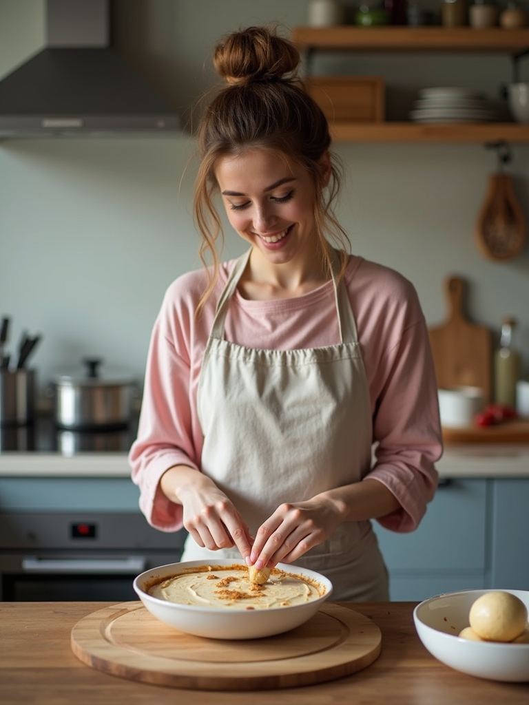 relaxed feminine model cooking or baking in a modern kitchen with a casual vibe
