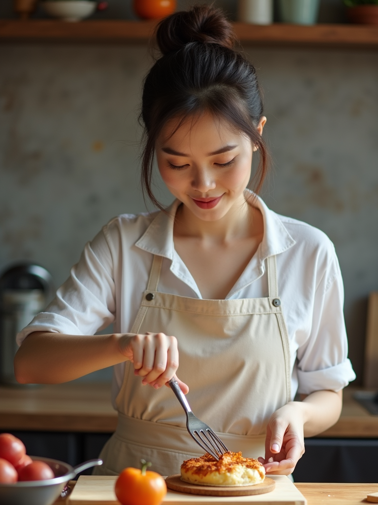 relaxed feminine model cooking or baking in a modern kitchen with a casual vibe