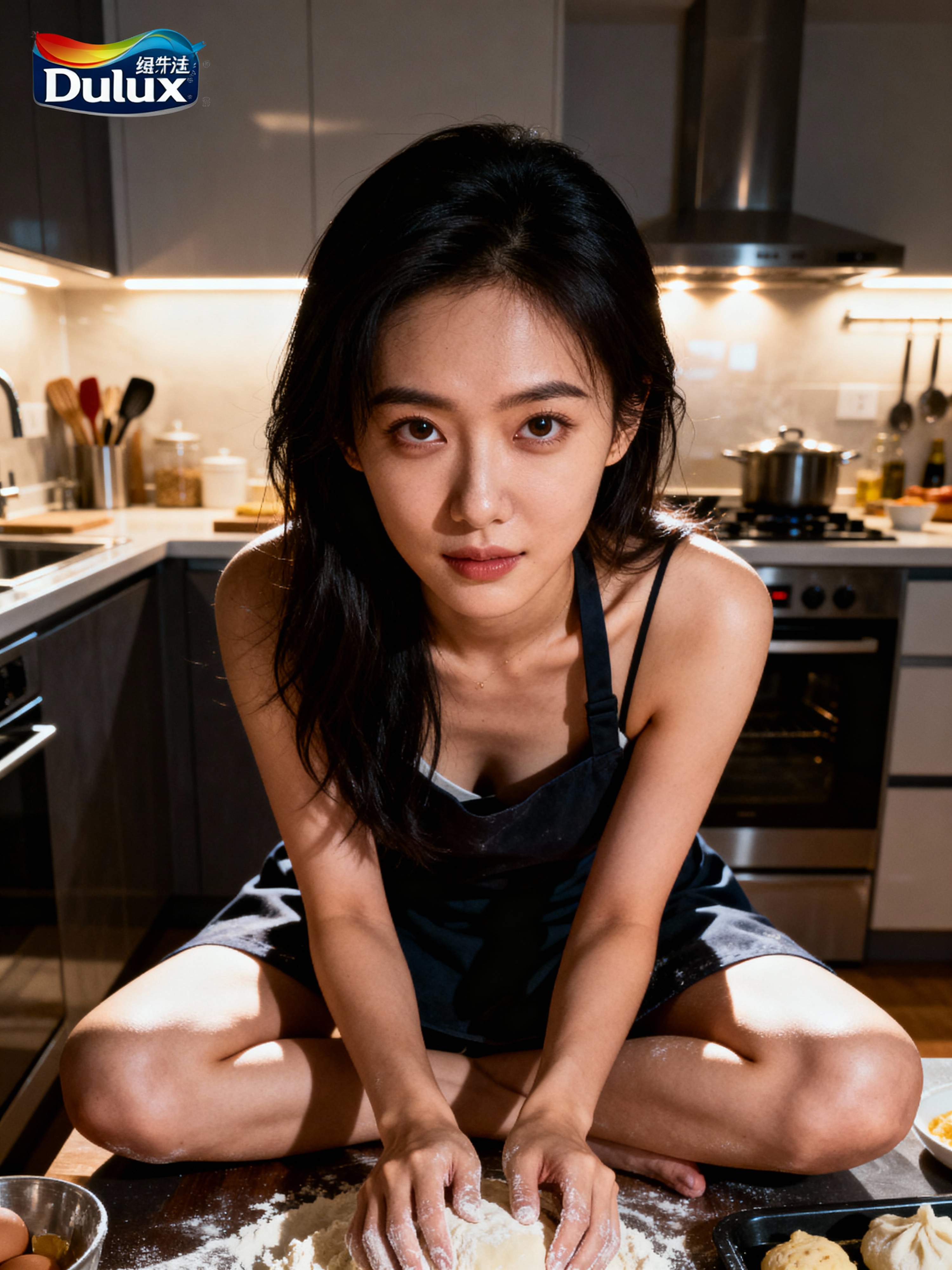 relaxed feminine model cooking or baking in a modern kitchen with a casual vibe