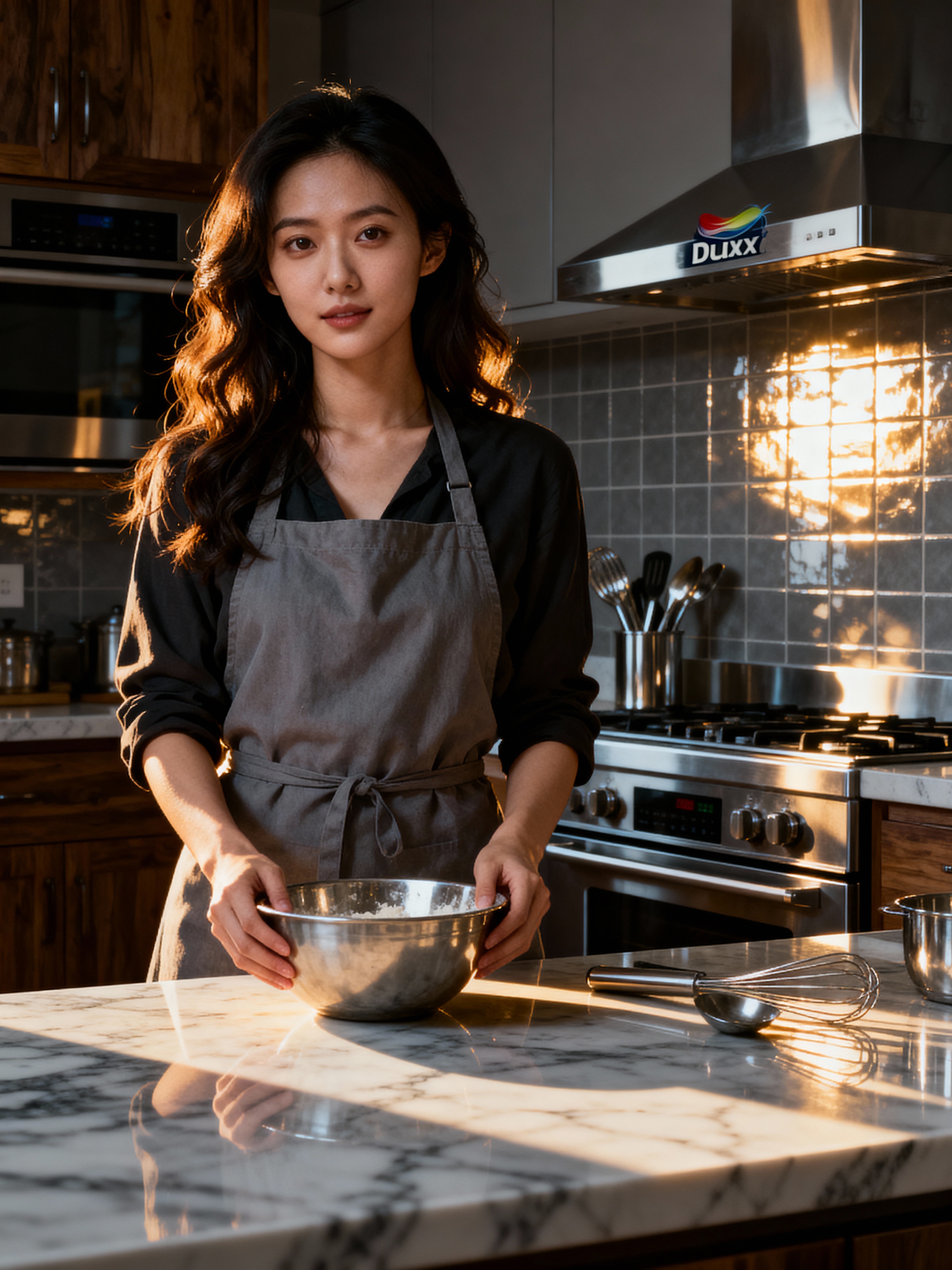 relaxed feminine model cooking or baking in a modern kitchen with a casual vibe