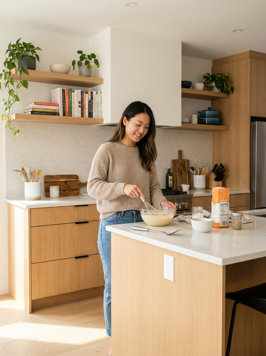 relaxed feminine model cooking or baking in a modern kitchen with a casual vibe