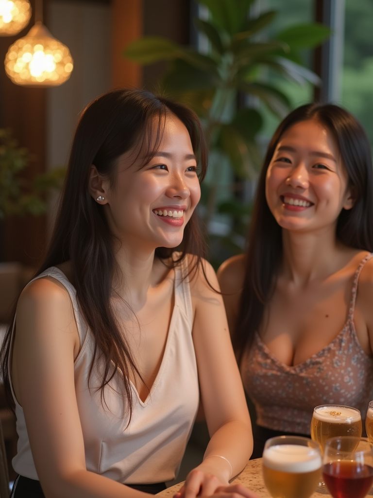 relaxed feminine model laughing with a small group of friends at a laid-back gathering