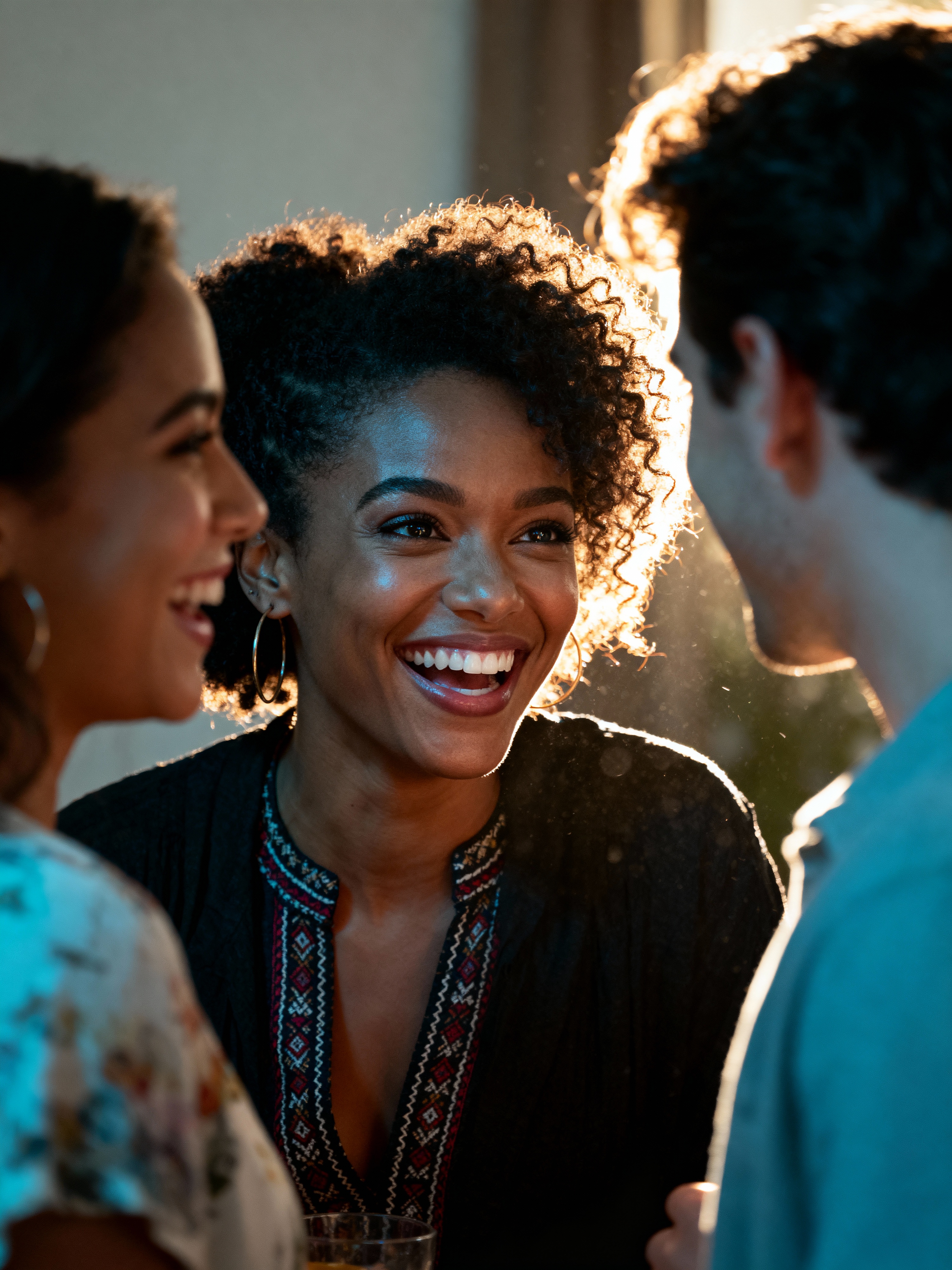 relaxed feminine model laughing with a small group of friends at a laid-back gathering
