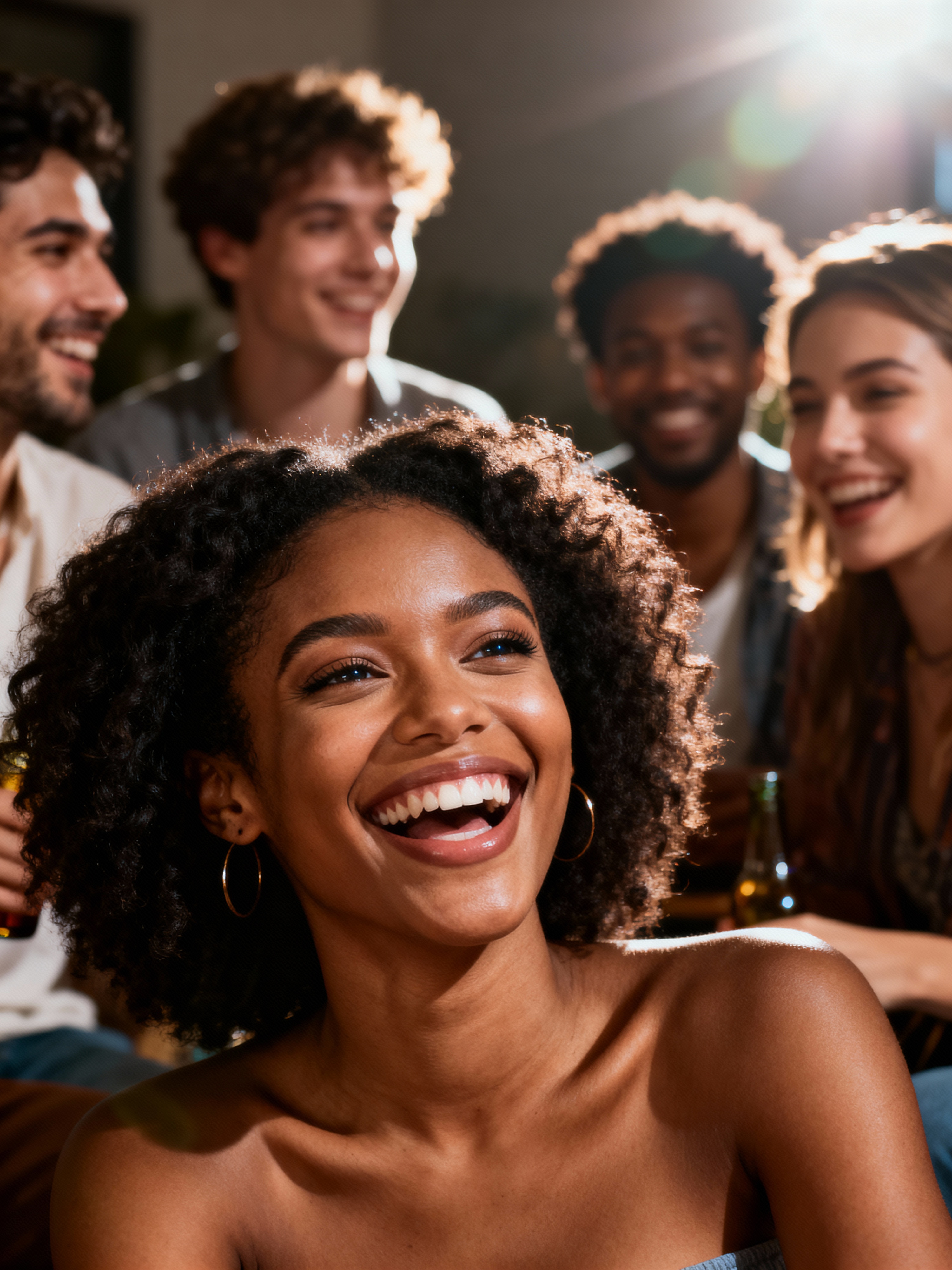 relaxed feminine model laughing with a small group of friends at a laid-back gathering