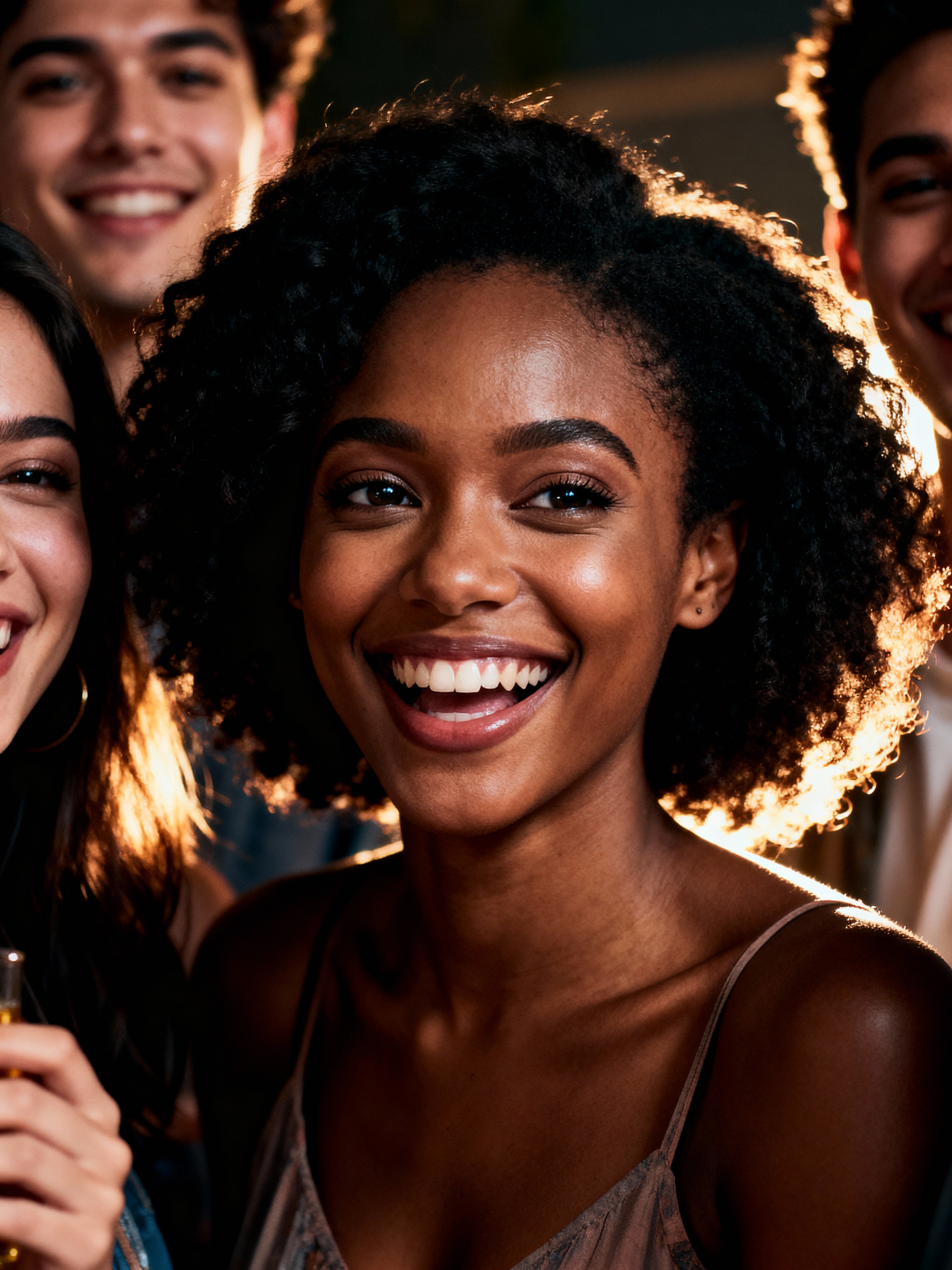 relaxed feminine model laughing with a small group of friends at a laid-back gathering