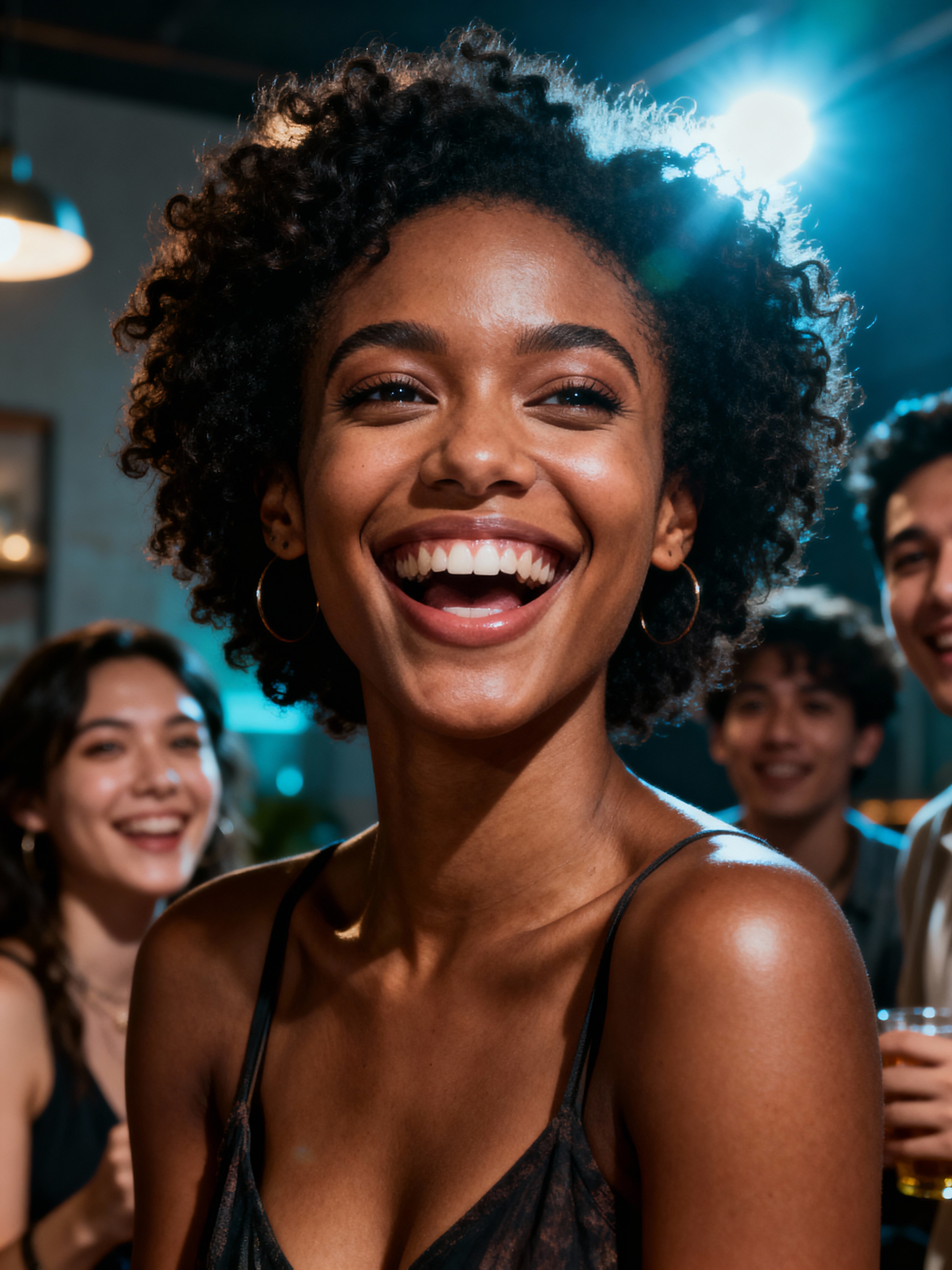 relaxed feminine model laughing with a small group of friends at a laid-back gathering