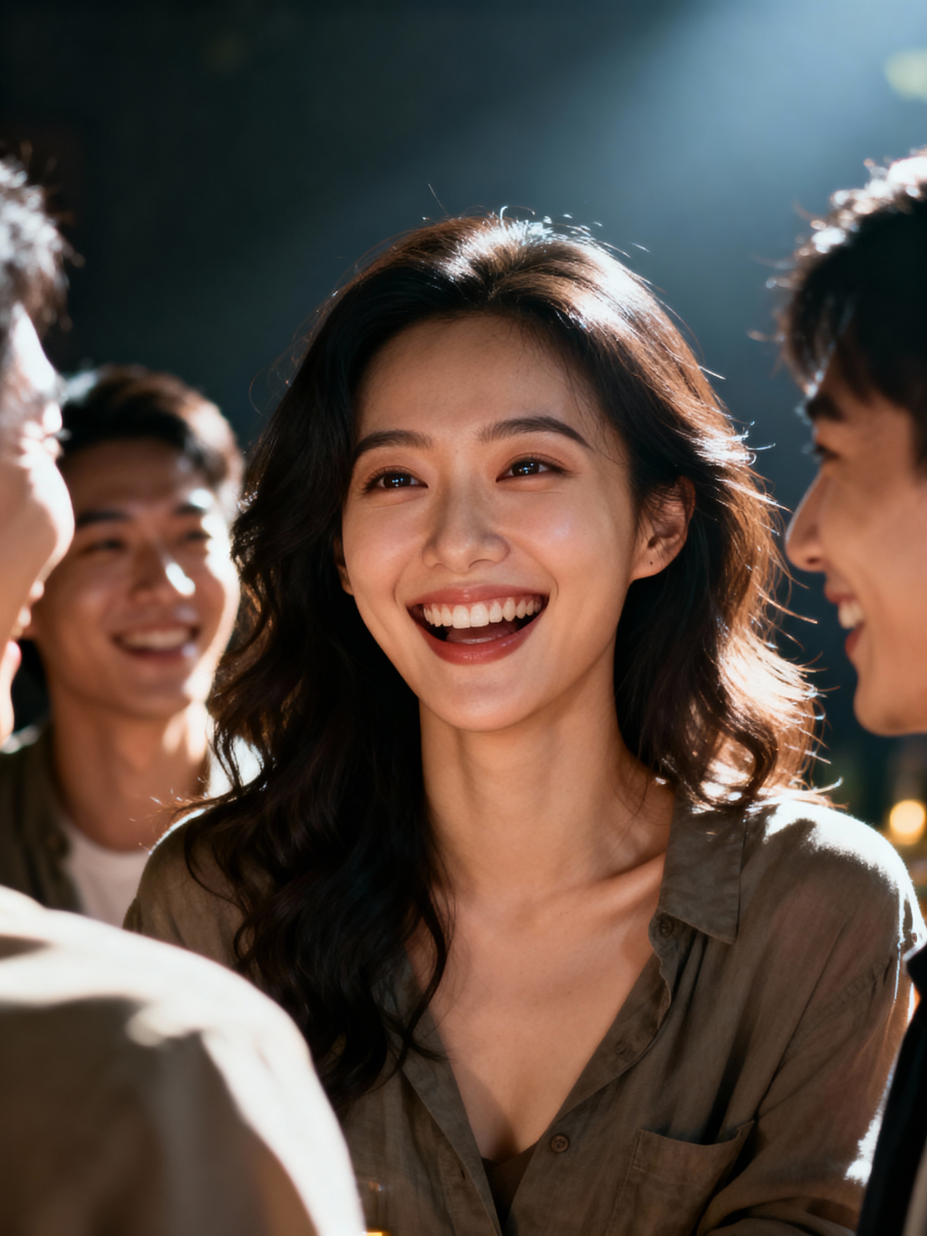 relaxed feminine model laughing with a small group of friends at a laid-back gathering