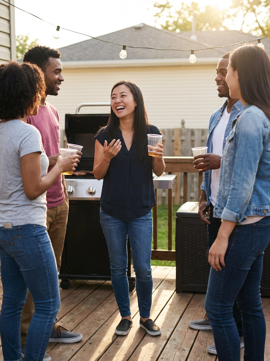 relaxed feminine model laughing with a small group of friends at a laid-back gathering