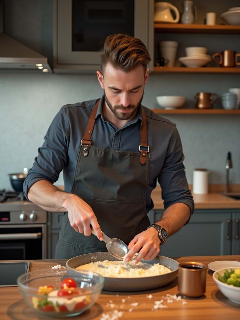 relaxed masculine model cooking or baking in a modern kitchen with a casual vibe