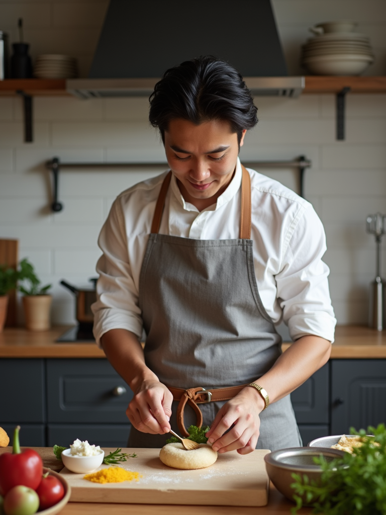 relaxed masculine model cooking or baking in a modern kitchen with a casual vibe