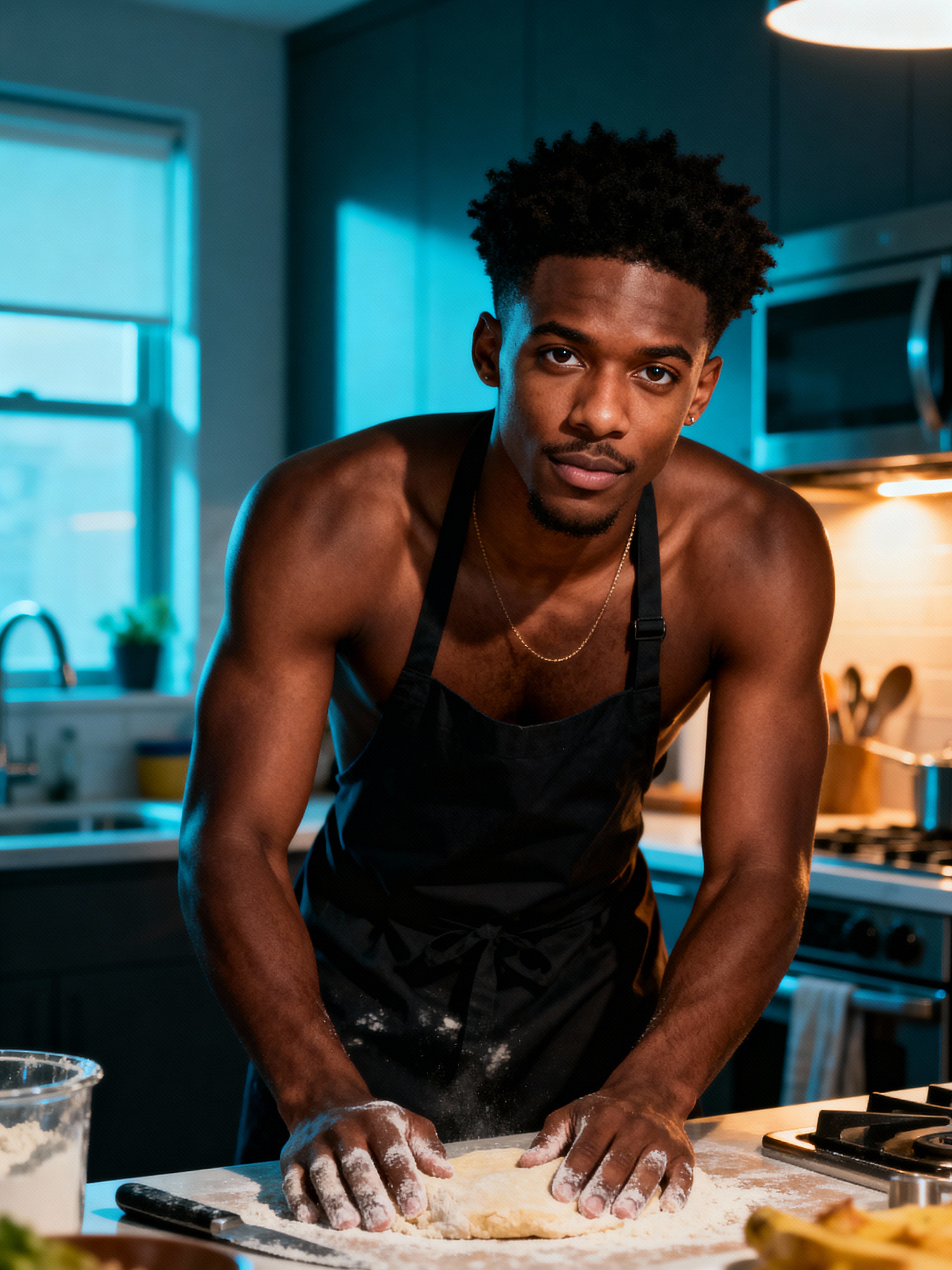 relaxed masculine model cooking or baking in a modern kitchen with a casual vibe