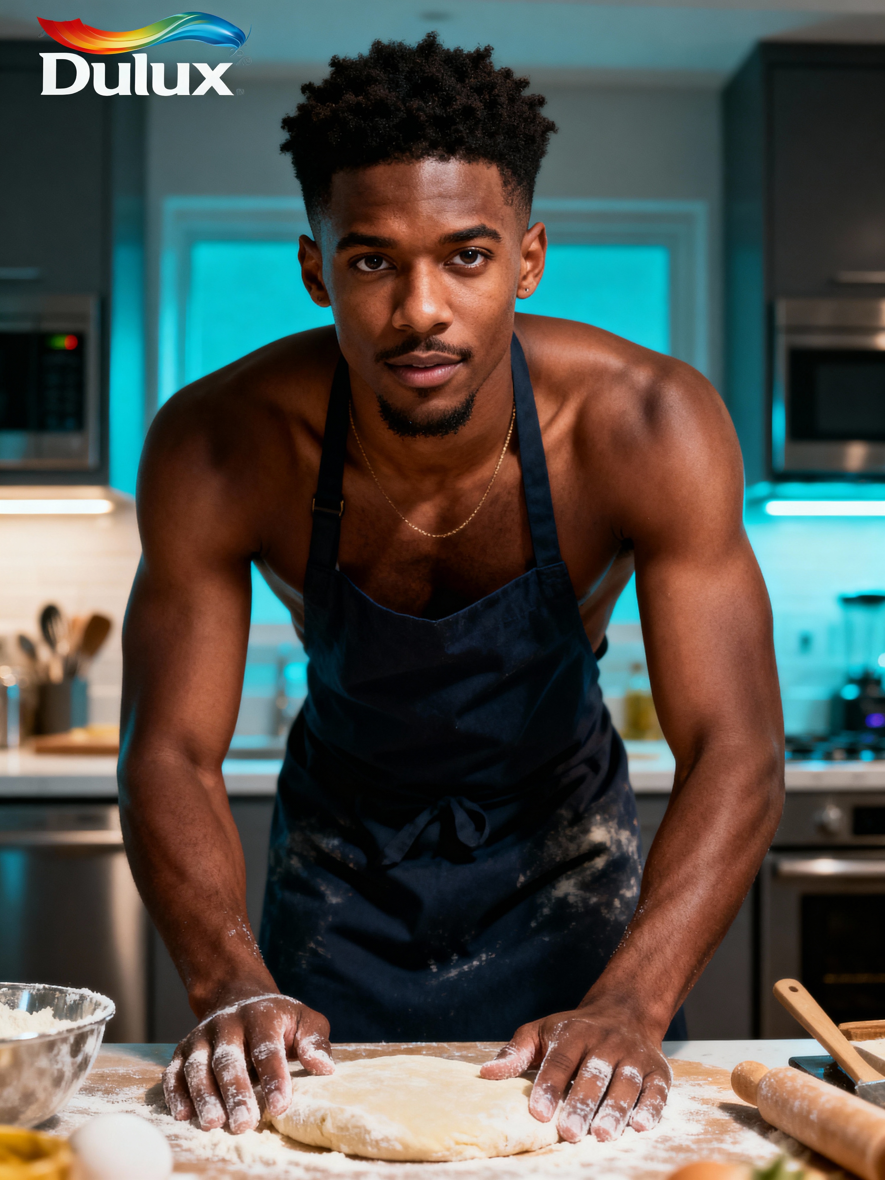relaxed masculine model cooking or baking in a modern kitchen with a casual vibe
