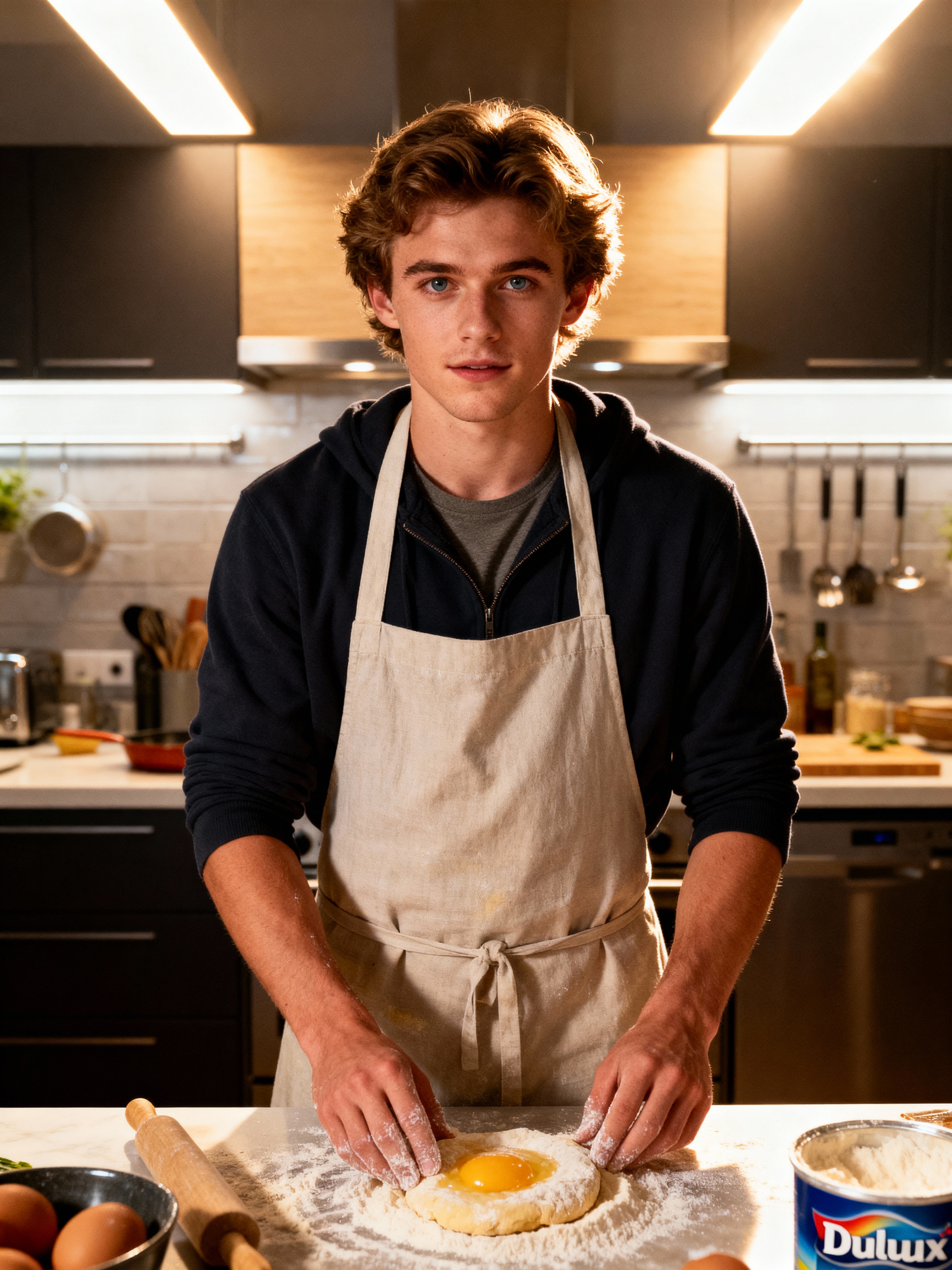 relaxed masculine model cooking or baking in a modern kitchen with a casual vibe