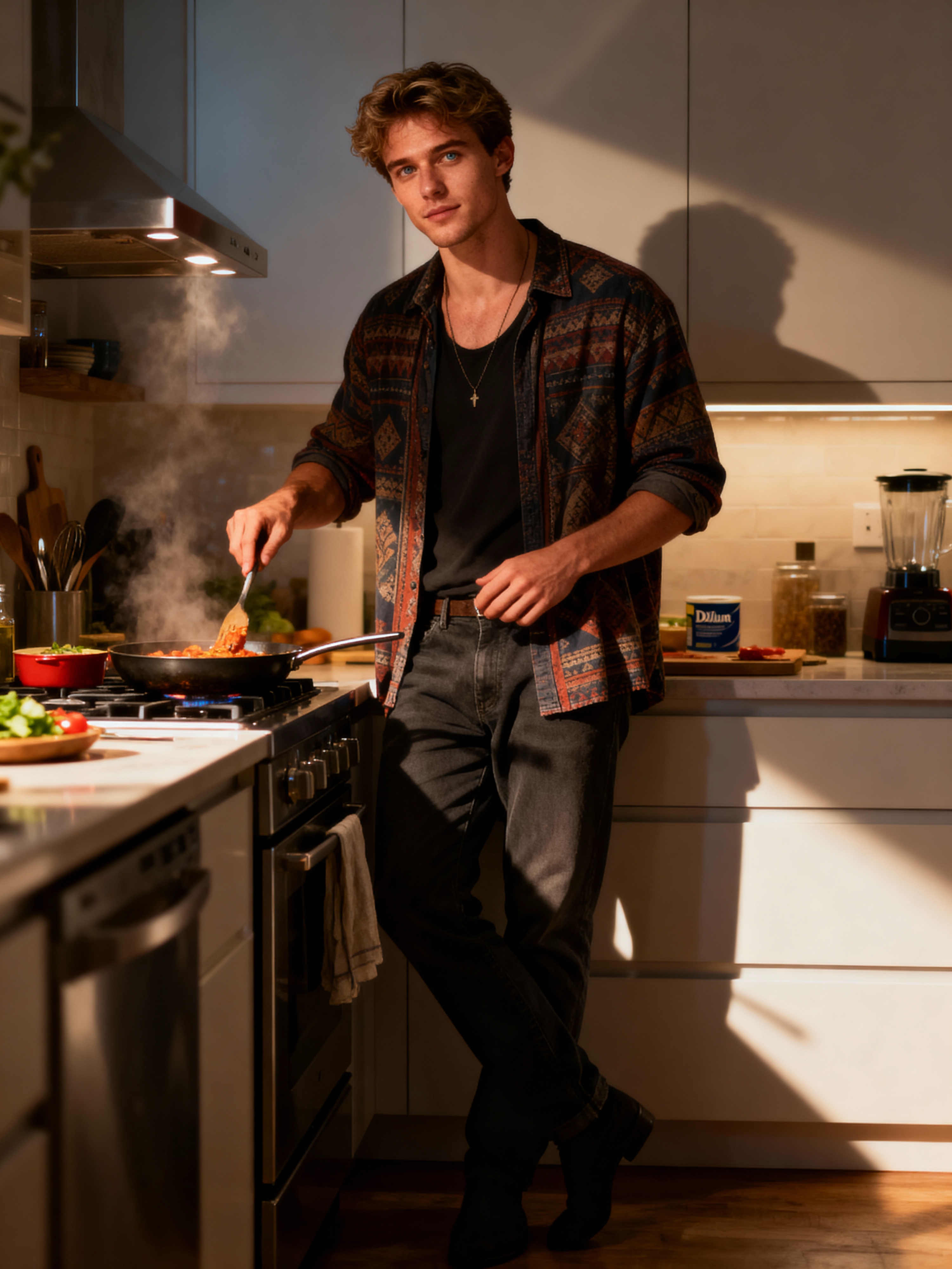 relaxed masculine model cooking or baking in a modern kitchen with a casual vibe