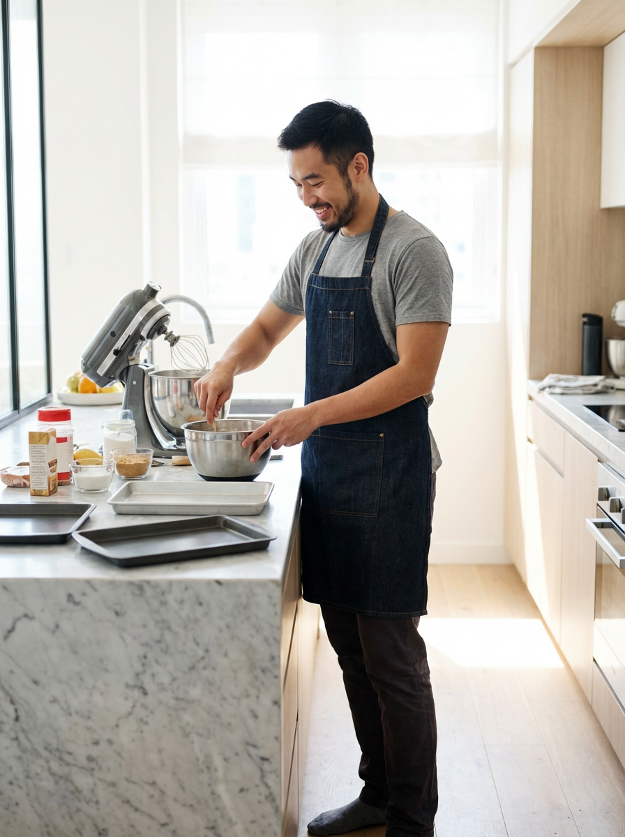 relaxed masculine model cooking or baking in a modern kitchen with a casual vibe