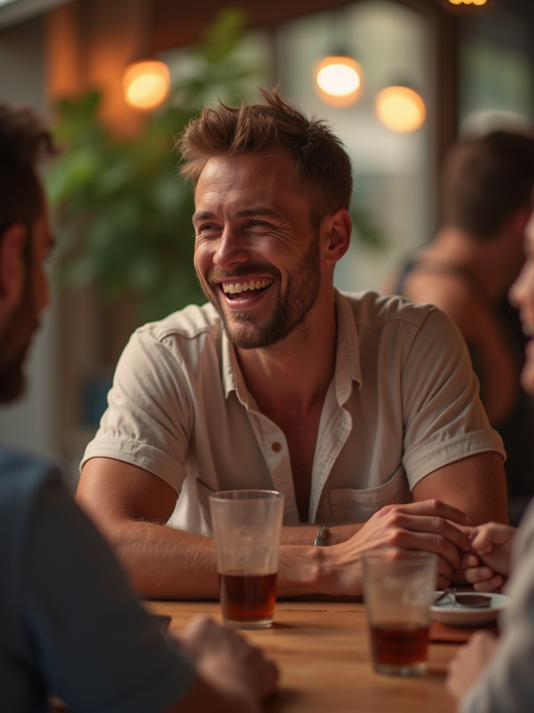 relaxed masculine model laughing with a small group of friends at a laid-back gathering