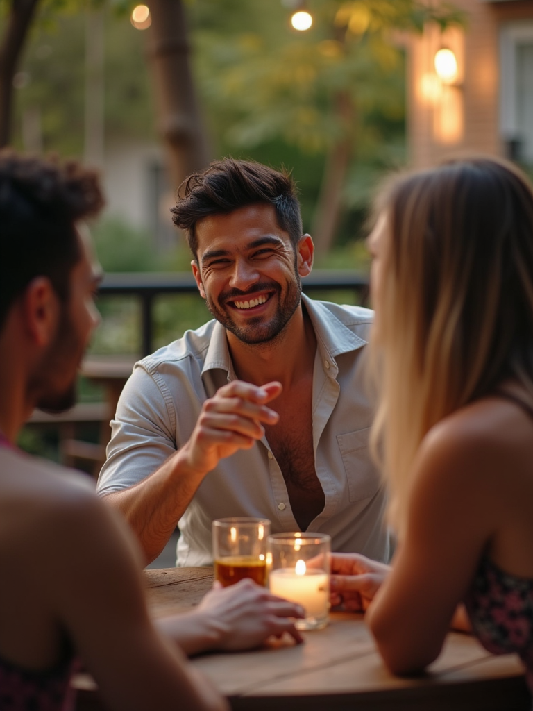 relaxed masculine model laughing with a small group of friends at a laid-back gathering