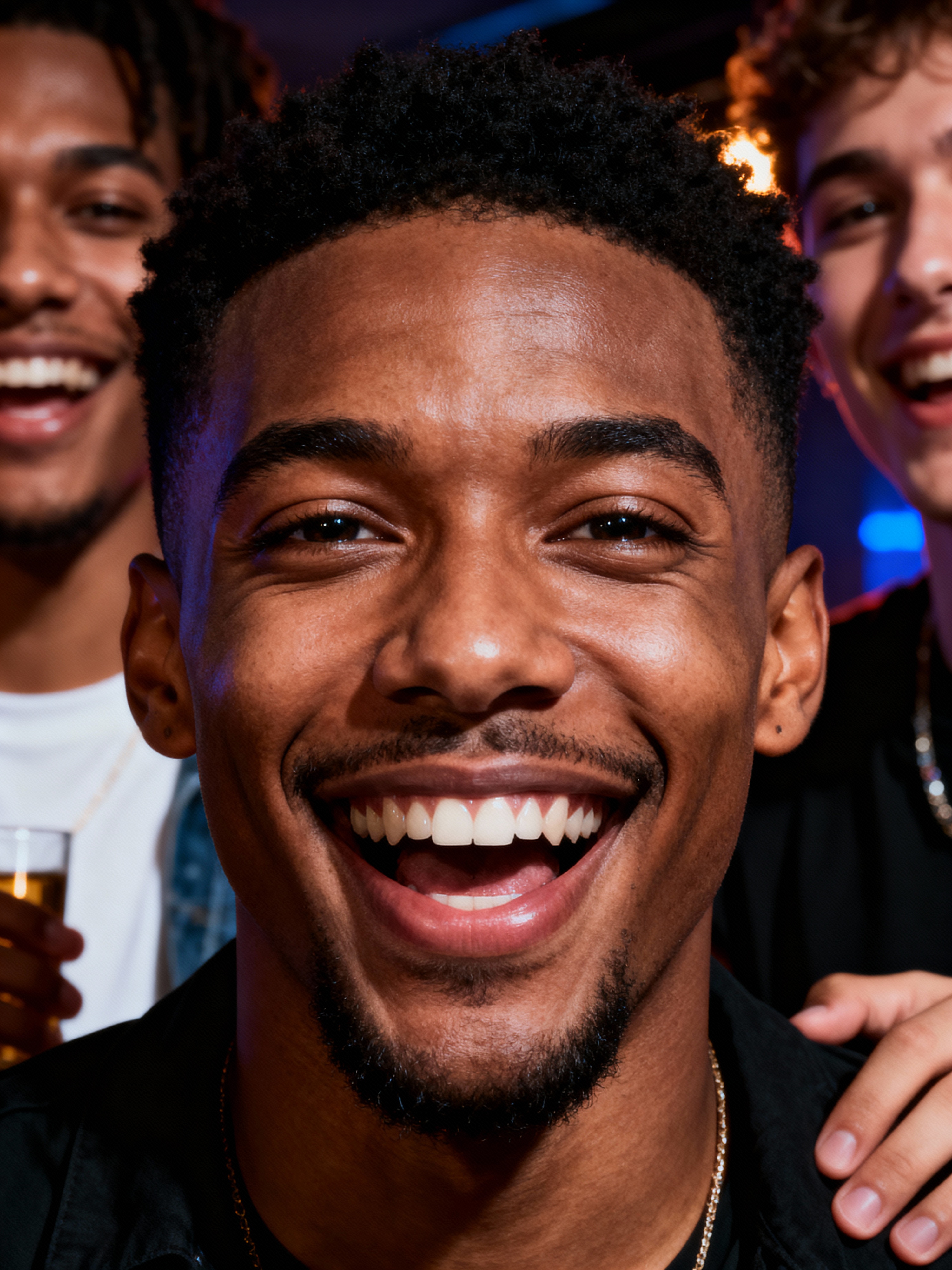 relaxed masculine model laughing with a small group of friends at a laid-back gathering