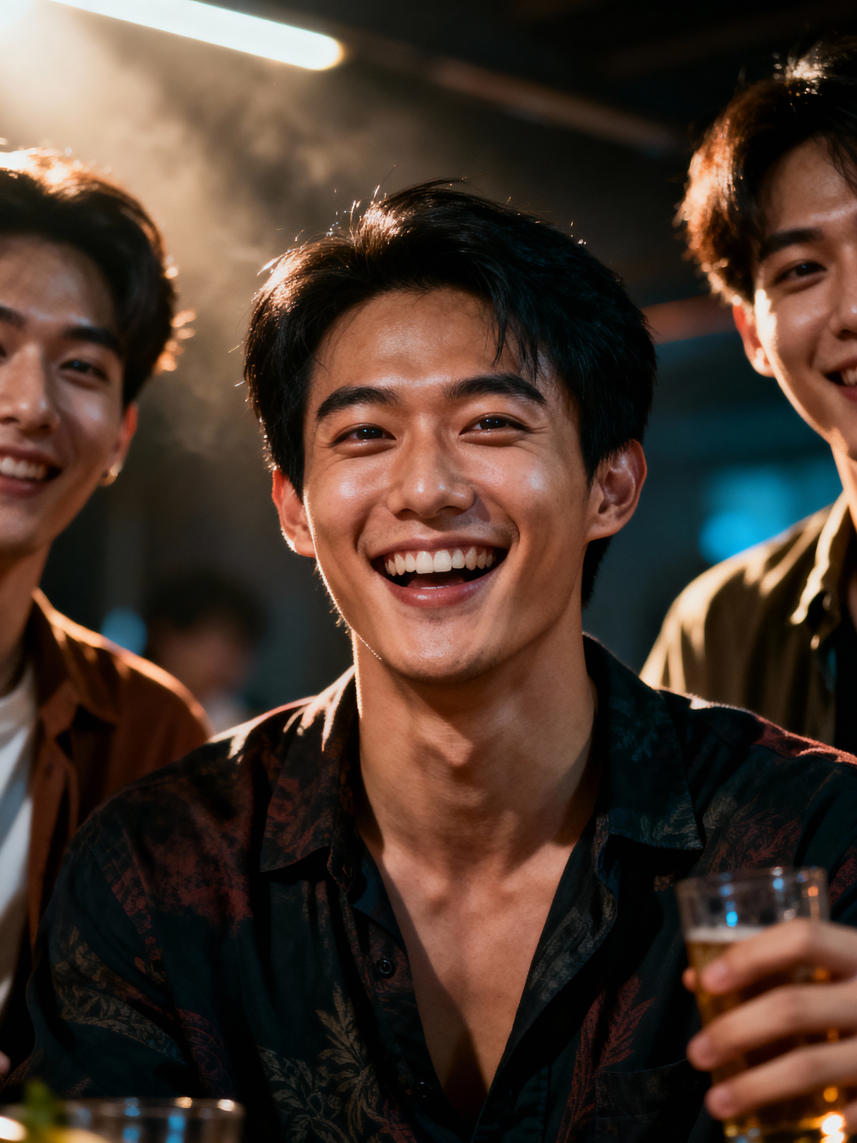 relaxed masculine model laughing with a small group of friends at a laid-back gathering