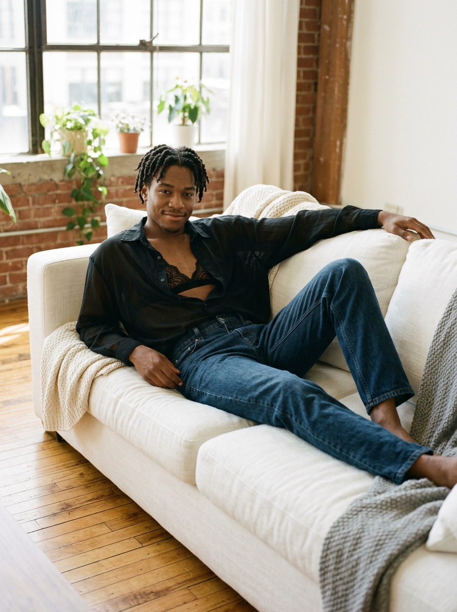 Relaxed yet alluring Victoria's Secret model on white linen couch, in high-waisted jeans and sheer button-up shirt lace bralette, legs extended playfully, cozy loft setting, natural window light, candid shot, fresh makeup, confident smile, casual-sexy fashion spread.