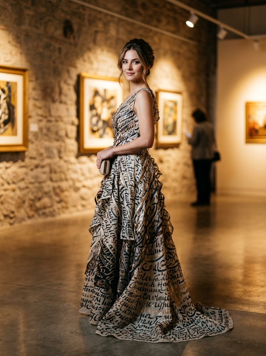 {"render_goal":"Art-couture cinematic portrait","subject":{"pose":"female standing slightly angled","expression":"soft intelligent smile"},"wardrobe":"flowing gown constructed from layered calligraphy-like fabric strokes","environment":{"location":"warm-toned gallery","props":"spot lighting, textured shadows"}}