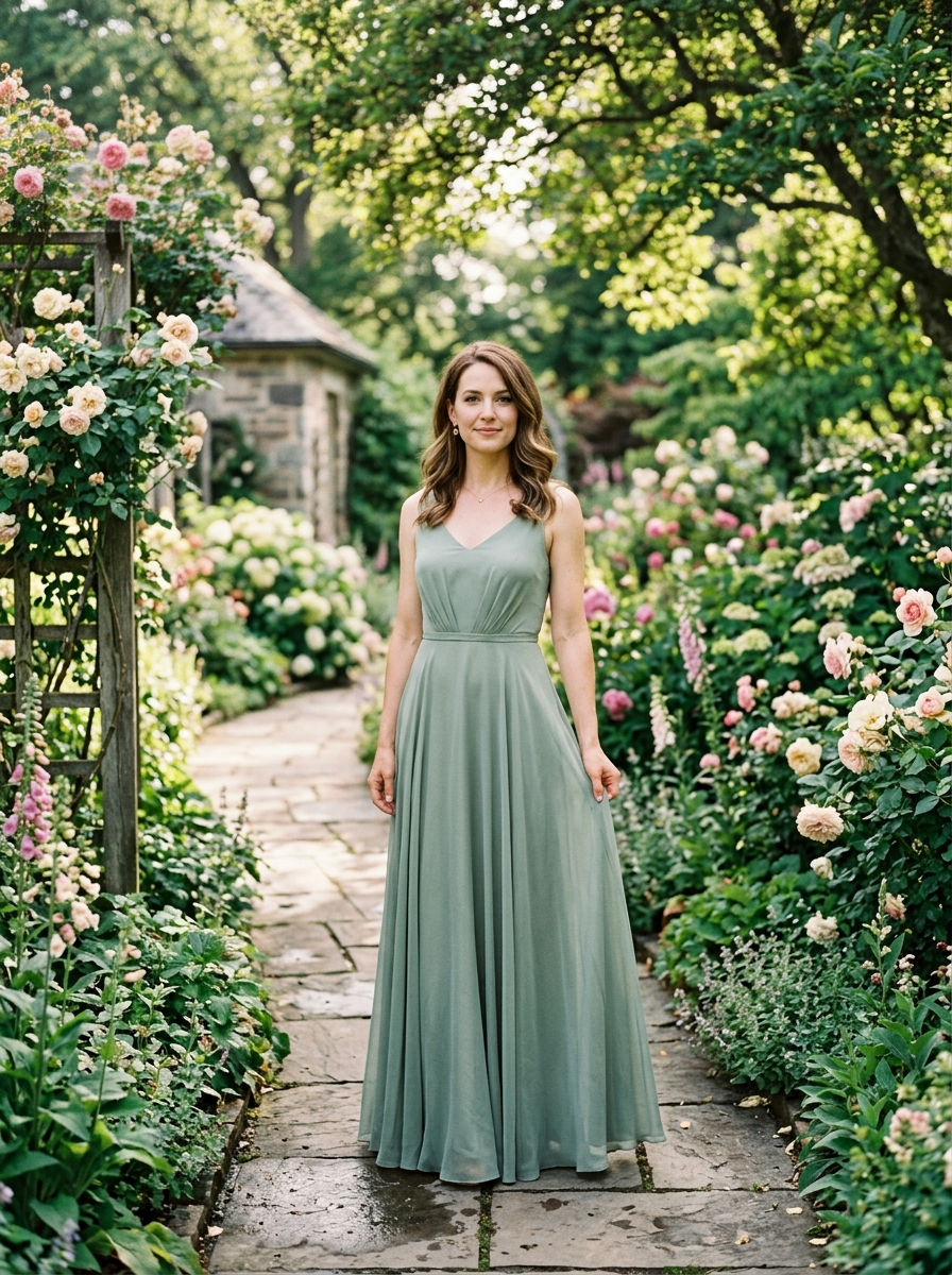 {"render_goal":"Natural cinematic garden portrait with timeless elegance","subject":{"pose":"female standing naturally on a garden path, relaxed posture","expression":"calm composed confidence with a genuine soft smile"},"wardrobe":"elegant silk chiffon gown in muted sage or soft ivory, minimal drape, realistic fabric weight, subtle movement, no shimmer, no fantasy elements","environment":{"location":"lush botanical garden in daylight","props":"realistic flowers and greenery, natural sunlight filtering through leaves, gentle shadows, earthy tones, organic depth of field"},"camera_style":"cinematic photography, 50mm lens look, shallow depth of field, natural skin texture, realistic color grading, film-like softness"}
