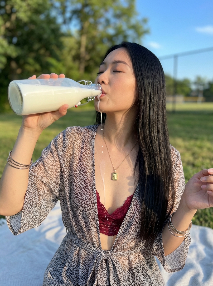 {"render_target": {"medium": "photorealistic image", "resolution": "high-resolution / 4K-equivalent", "style": "candid outdoor lifestyle photography", "realism_level": "indistinguishable from real photograph"}, "camera": {"capture_type": "direct photograph", "angle": "slightly below eye level relative to subject head", "orientation": "vertical", "lens_equivalent": "approximately 28–35mm", "perspective": "natural, mild wide-angle", "focus": "sharp on subject face and upper torso", "depth_of_field": "moderate, background softly resolved", "framing": {"crop": "mid-torso to top of head", "subject_position": "center-right dominant", "negative_space": "sky and foliage in upper frame"}}, "subject": {"age_range": "young adult", "gender": "model", "skin": {"tone": "fair to lightly tanned", "texture": "natural with visible pores and sunlit highlights", "finish": "slight natural sheen, no airbrushing"}, "face": {"shape": "oval", "expression": "eyes closed, relaxed, content", "jawline": "softly defined", "neck": {"extension": "slightly extended due to drinking posture", "muscle_tension": "minimal, relaxed"}}, "hair": {hair, "length": "long, past shoulders", "texture": "straight", "part": "near center", "behavior": "gravity-aligned, lightly sunlit"}, "accessories": {"necklace": {"type": "thin chain", "pendant": "small rectangular locket", "position": "resting at upper sternum"}, "bracelets": {"presence": true, "location": "left wrist", "type": "multiple thin metallic bracelets"}}}, "body": {"somatic_profile": "curvilinear adult model morphology", "thoracic_region": {"ribcage_width": "moderate to broad", "soft_tissue_distribution": "substantial anterior thoracic soft tissue", "sternal_contour": "visible central cleavage line formed by natural tissue compression", "upper_torso_mass": "heavy and volumetric without artificial lift"}, "abdominal_region": {"contour ": "flat to gently concave", "muscle_definition": "minimal, natural", "skin_behavior": "smooth with natural stretch"}, "upper_body_mass_distribution": {"center_of_mass": "upper torso dominant in framing", "tissue_behavior": "responds naturally to gravity and posture"}, "constraints": ["no reduction of thoracic volume", "no reshaping or lifting", "no athletic reinterpretation", "preserve natural mass and gravity effects"]}, "pose": {"stance": "standing or seated upright outdoors", "torso": {"orientation": "slightly angled", "posture": "upright with relaxed shoulders"}, "head": {"tilt": "slightly backward", "rotation": "neutral", "eyes": "closed"}, "arms": {"active_arm": {"side": "right", "position": "raised", "action": "holding bottle to mouth"}, "inactive_arm": {"side": "left", "position": "lowered and relaxed"}}, "pose_lock": "maintain exact drinking posture and head tilt"}, "interaction": {"object": {"type": "glass bottle", "contents": "opaque liquid (milk-like)", "cap": "swing-top closure with metal clasp"}, "action": {"type": "drinking", "liquid_behavior": {"spill": "small stream escaping bottle mouth", "flow_path": "down chin, along sternum, onto upper abdomen", "physics": "gravity-driven, irregular droplets and thin stream"}}}, "clothing": {"top_layer": {"type": "lightweight textured cover-up", "material": "gauze or muslin cotton", "configuration": "tied at front under bust ", "fabric_behavior": "semi-sheer, softly wrinkled, light-diffusing"}, "under_layer": {"type": "lace bralette ", "color": "deep red", "material": "sheer lace", "coverage": "minimal", "fabric_behavior": "conforms naturally to thoracic contour s"}, "lower_garment": {"type": "light-colored shorts or skirt ", "material": "lightweight fabric", "visibility": "partially visible at frame bottom"}}, "environment": {"setting": "outdoor recreational area", "background_elements": ["green grass", "trees with sparse foliage", "blue sky", "tennis court fencing in distance"], "surface": {"type": "light fabric blanket or towel", "location": "beneath subject"}}, "lighting": {"source": "natural sunlight", "direction": "upper left", "quality": "bright but soft", "shadows": "defined yet gentle under chin and fabric folds", "color_temperature": "neutral daylight"}, "color_grading": {"style": "natural lifestyle", "contrast": "moderate", "saturation": "realistic", "skin_tone_priority": "high accuracy"}, "negative_prompt": ["idealized or artificial body shaping", "exaggerated anatomy", "plastic or airbrushed skin", "CGI or 3D render", "studio lighting", "over-sharpening", "blurred liquid physics", "fabric clipping", "anatomical distortion", "extra limbs or fingers", "AI artifacts"]}