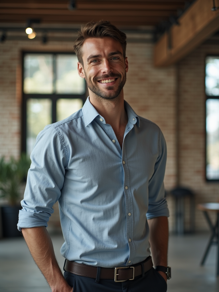 resilient model in relaxed business casual with quality basics industrial loft office, working with team members