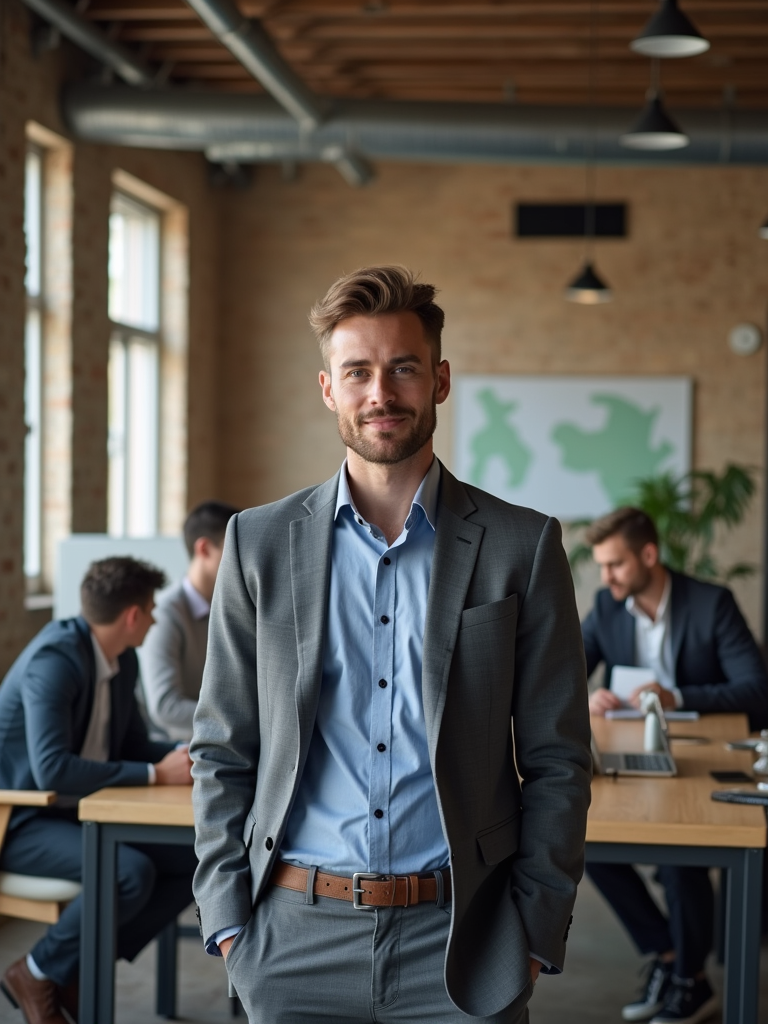 resilient model in relaxed business casual with quality basics industrial loft office, working with team members