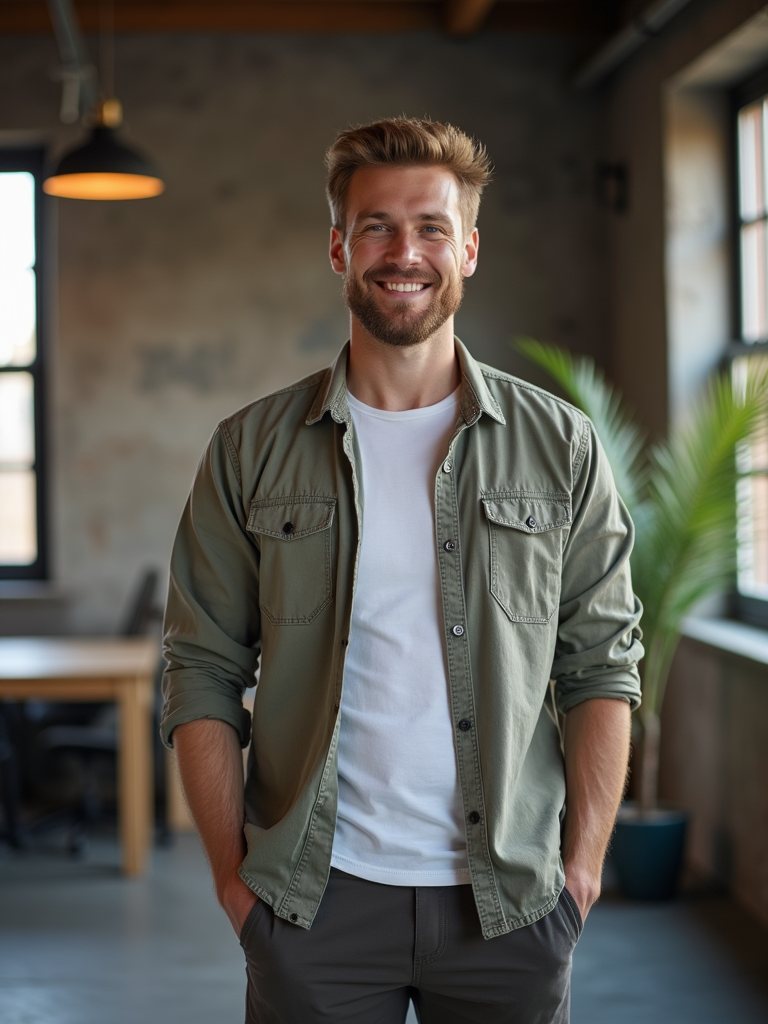 resilient model in relaxed business casual with quality basics industrial loft office, working with team members