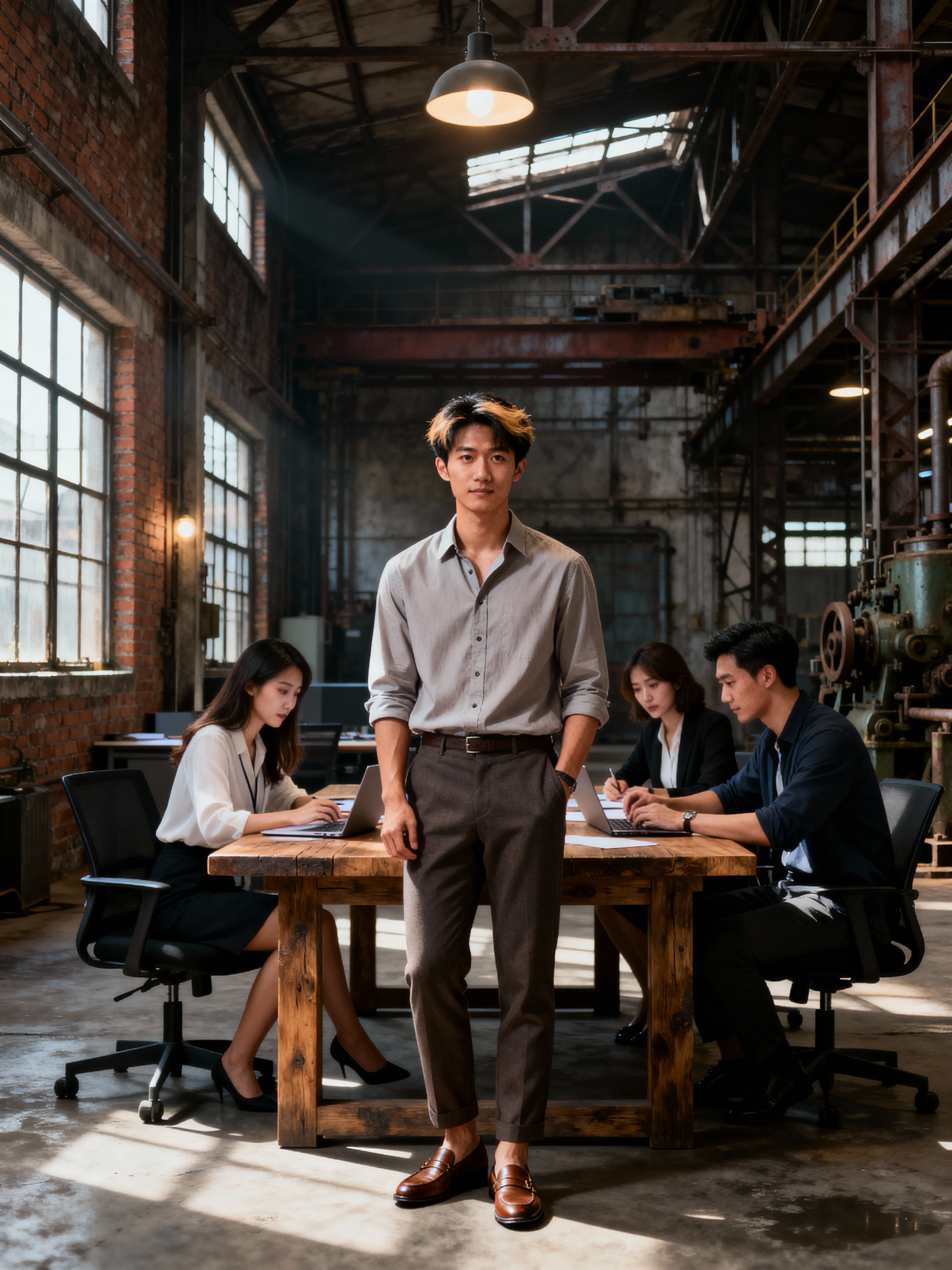 resilient model in relaxed business casual with quality basics industrial loft office, working with team members