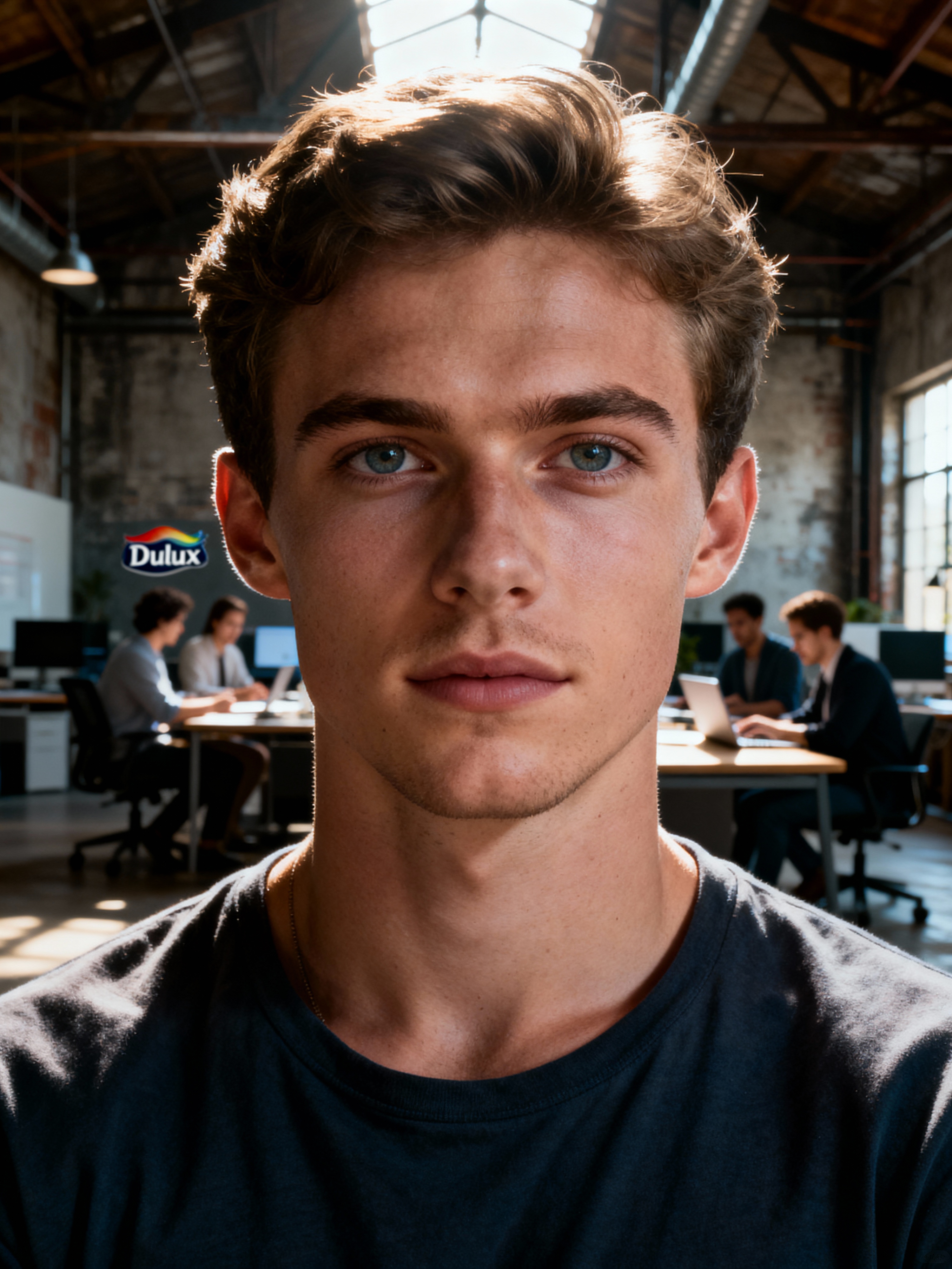 resilient model in relaxed business casual with quality basics industrial loft office, working with team members