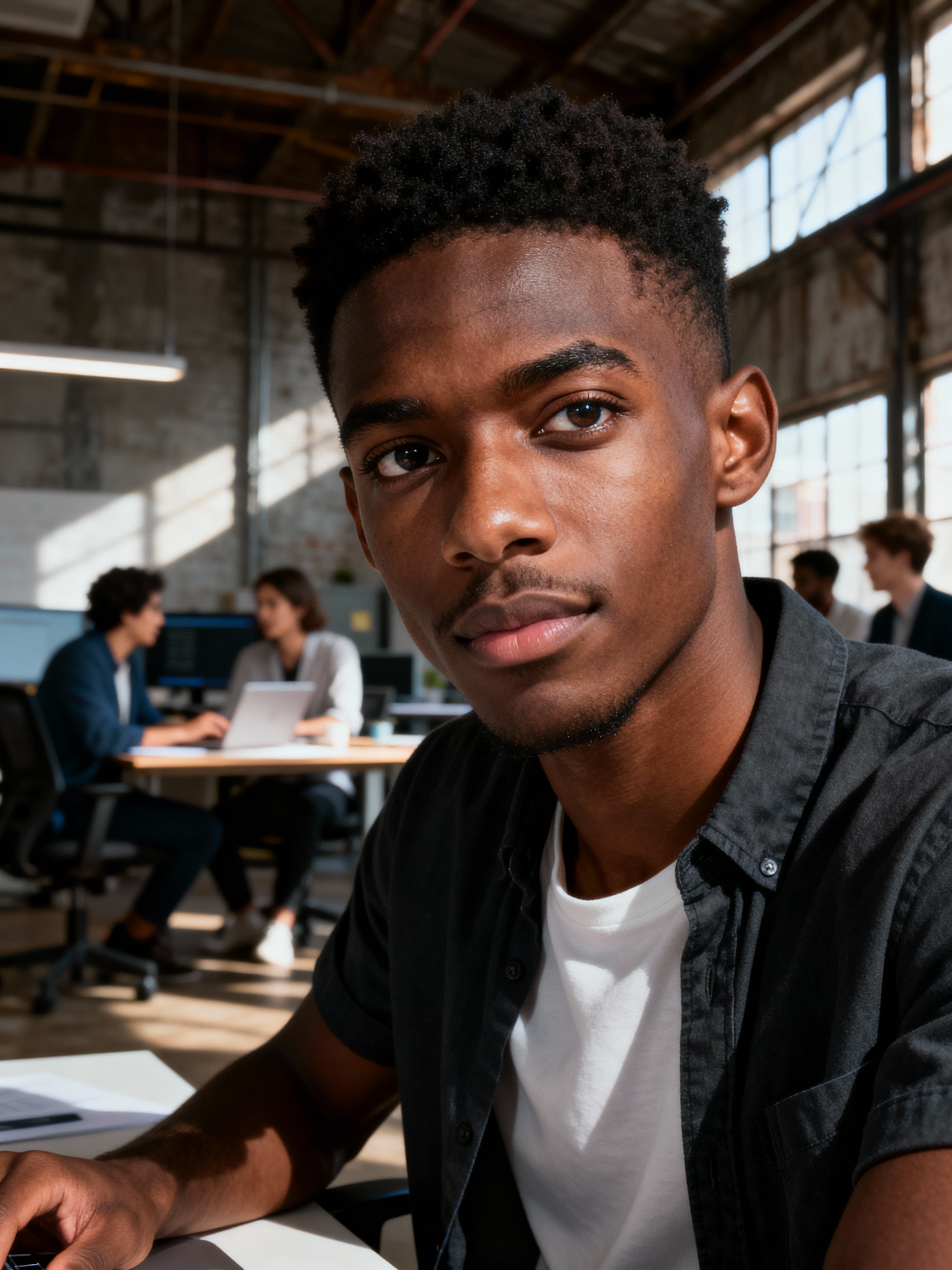 resilient model in relaxed business casual with quality basics industrial loft office, working with team members