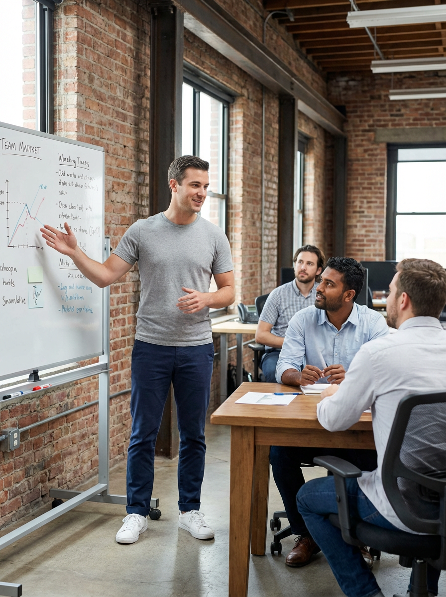 resilient model in relaxed business casual with quality basics industrial loft office, working with team members