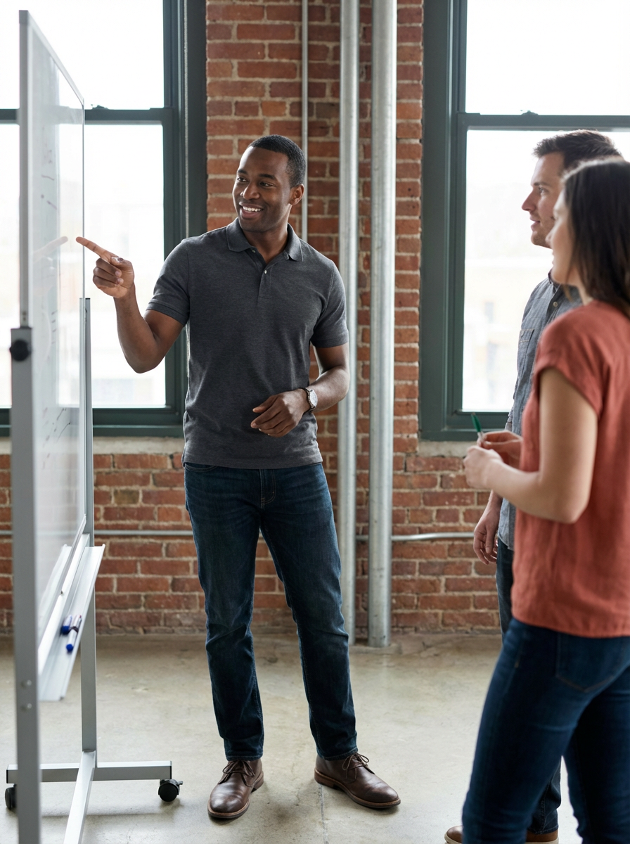 resilient model in relaxed business casual with quality basics industrial loft office, working with team members