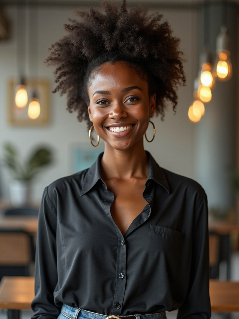 resilient model in comfortable yet polished professional attire industrial loft office, working with team members