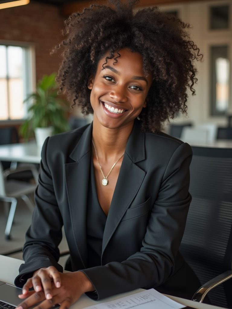 resilient model in comfortable yet polished professional attire industrial loft office, working with team members