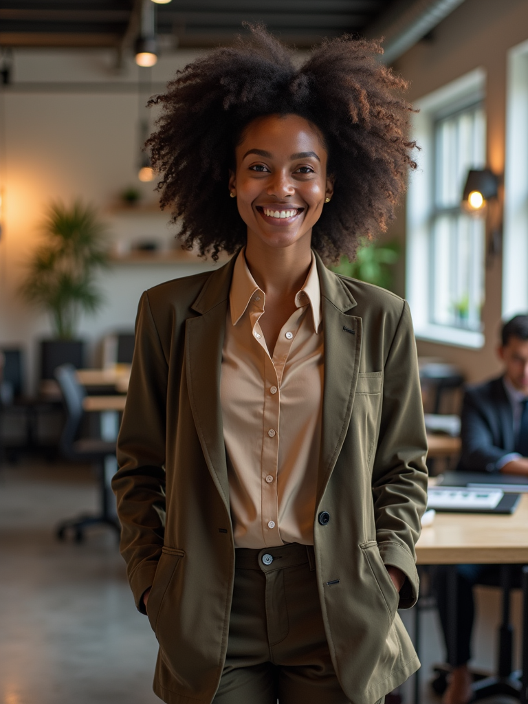 resilient model in comfortable yet polished professional attire industrial loft office, working with team members