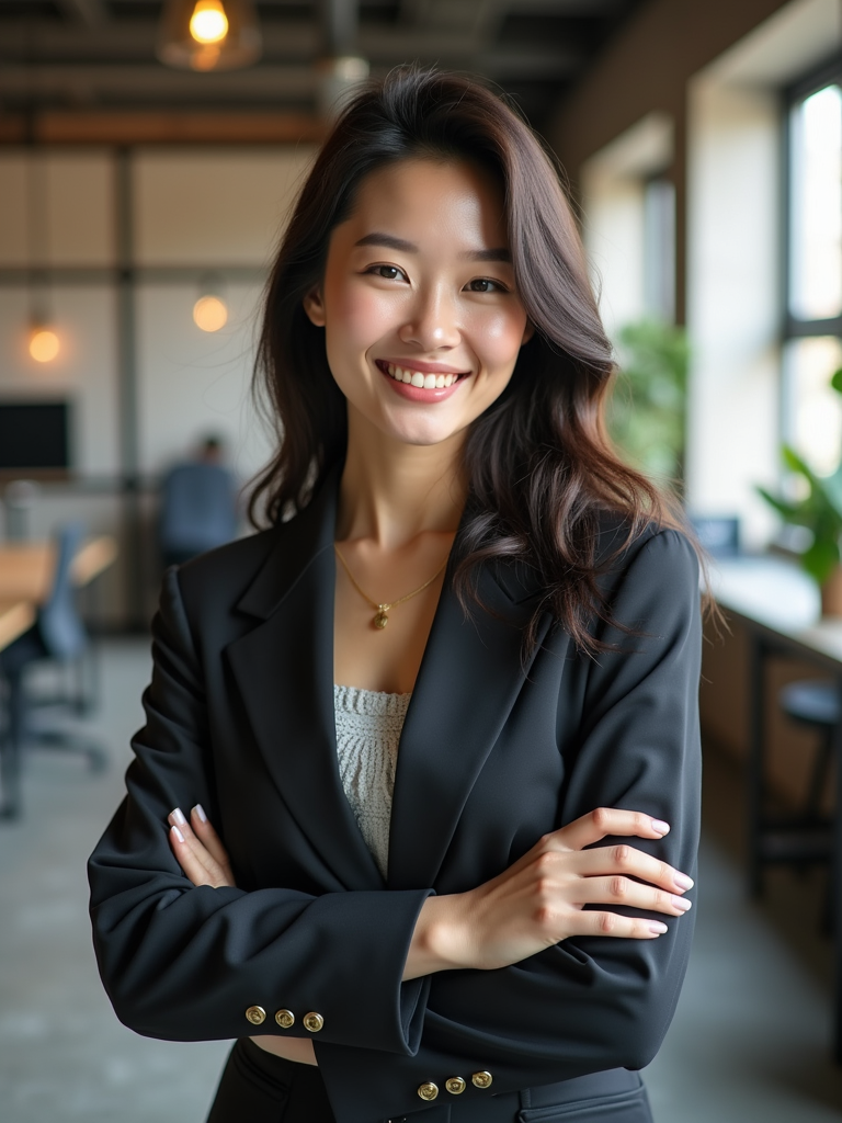 resilient model in comfortable yet polished professional attire industrial loft office, working with team members