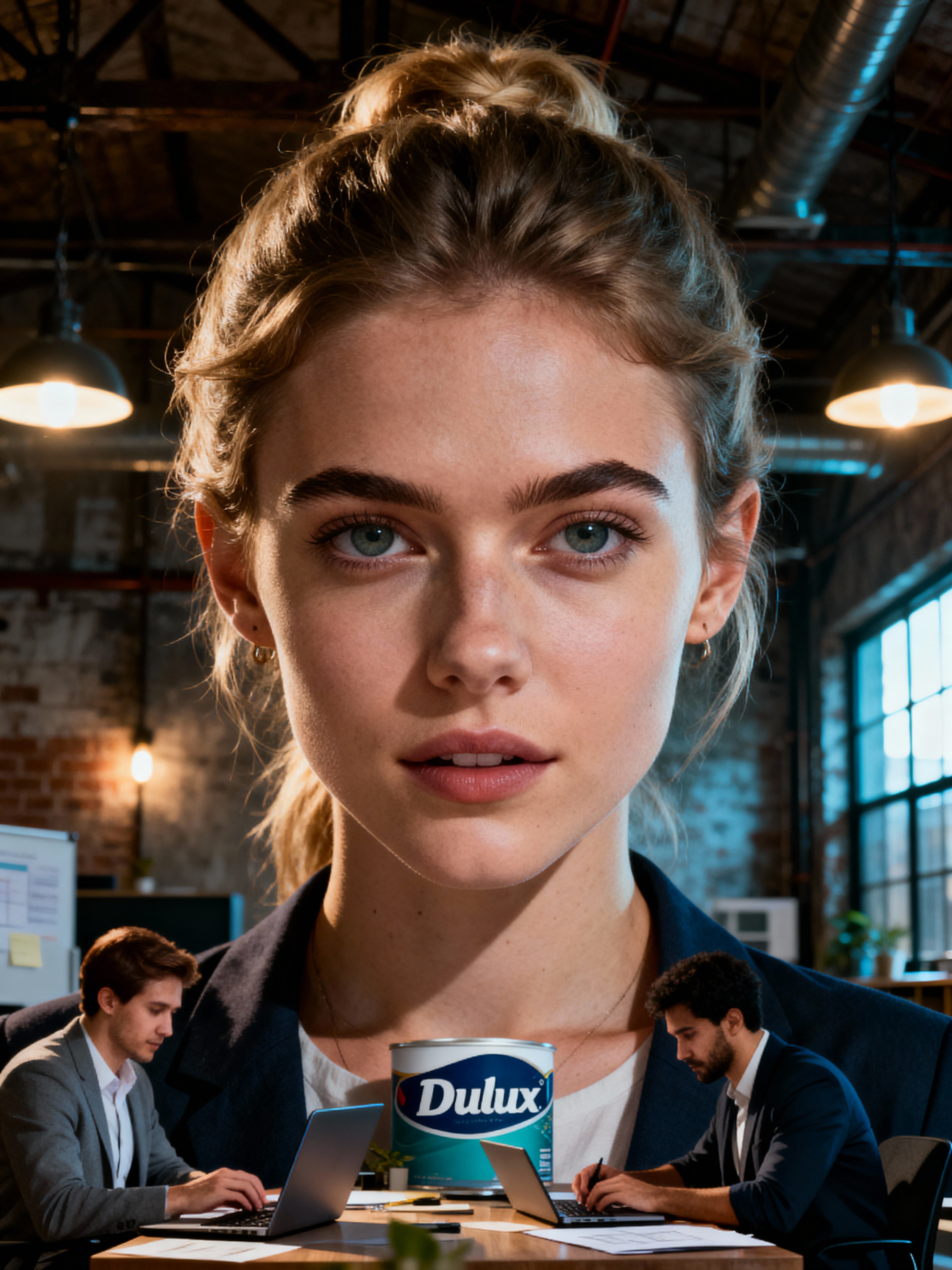 resilient model in comfortable yet polished professional attire industrial loft office, working with team members