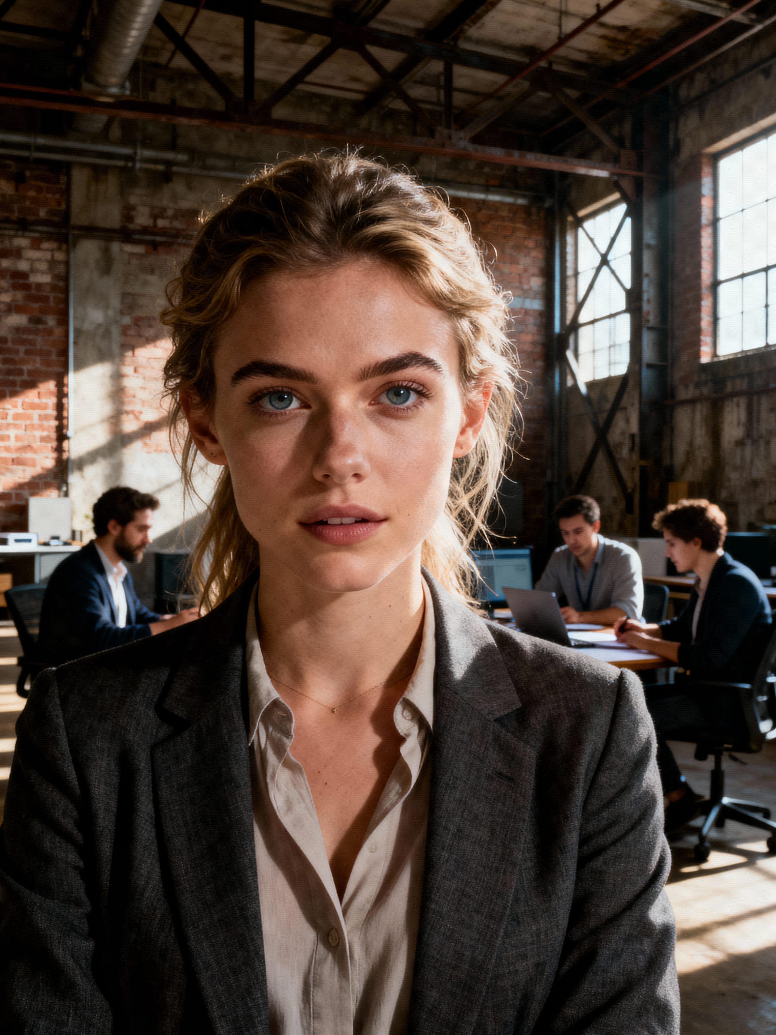 resilient model in comfortable yet polished professional attire industrial loft office, working with team members