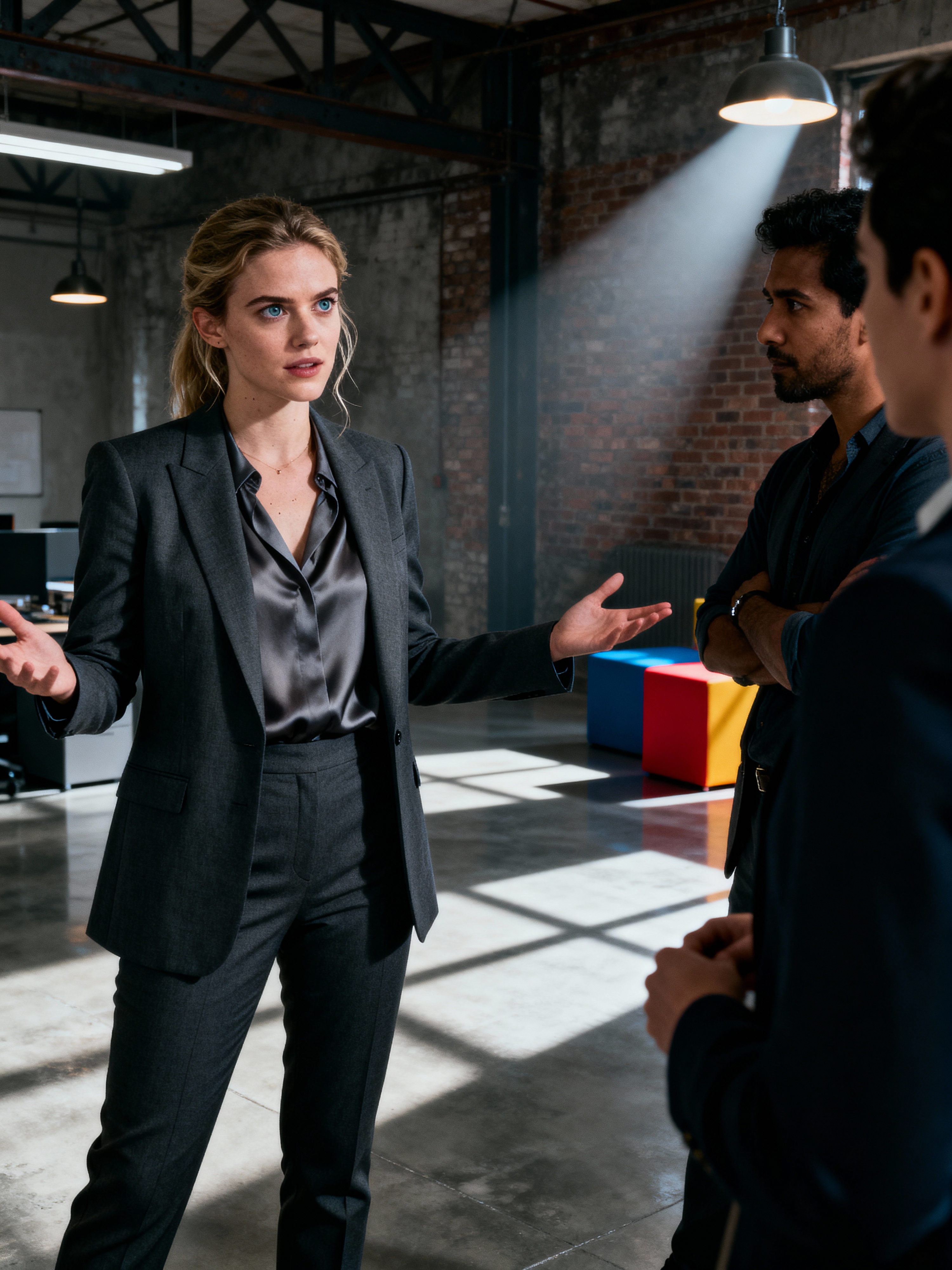 resilient model in comfortable yet polished professional attire industrial loft office, working with team members