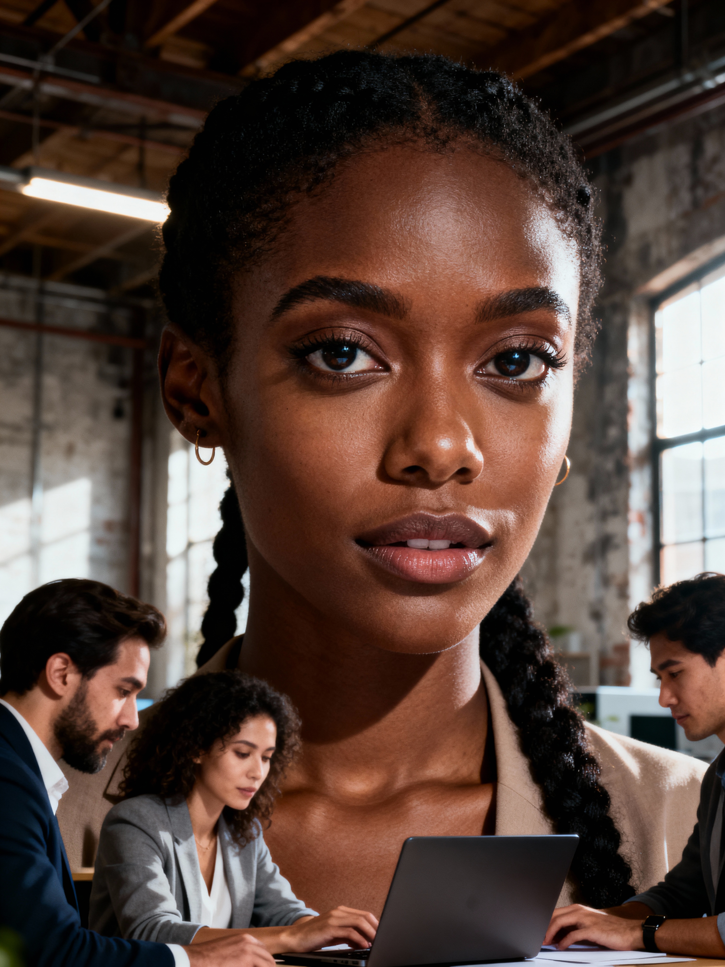 resilient model in comfortable yet polished professional attire industrial loft office, working with team members
