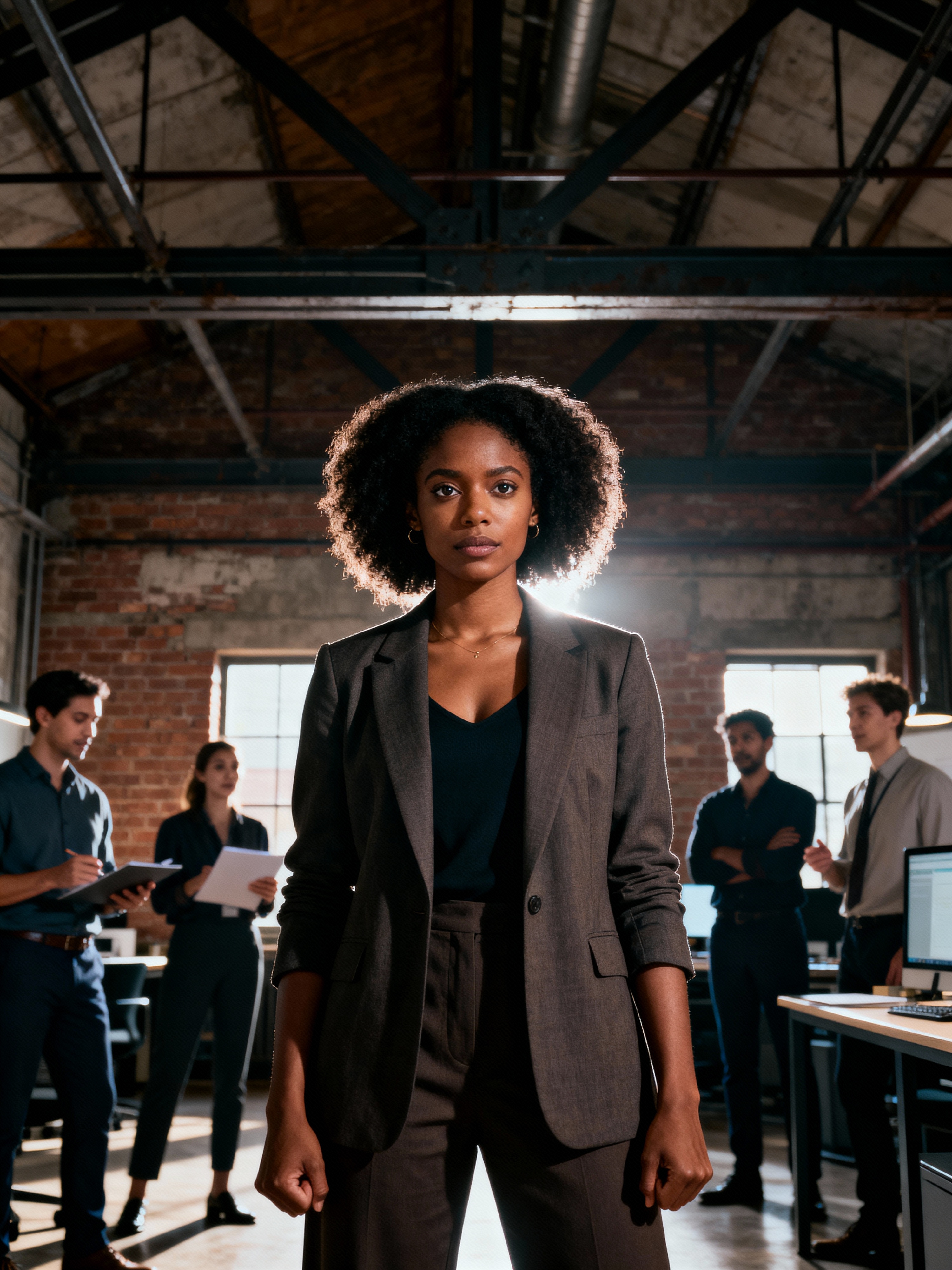 resilient model in comfortable yet polished professional attire industrial loft office, working with team members