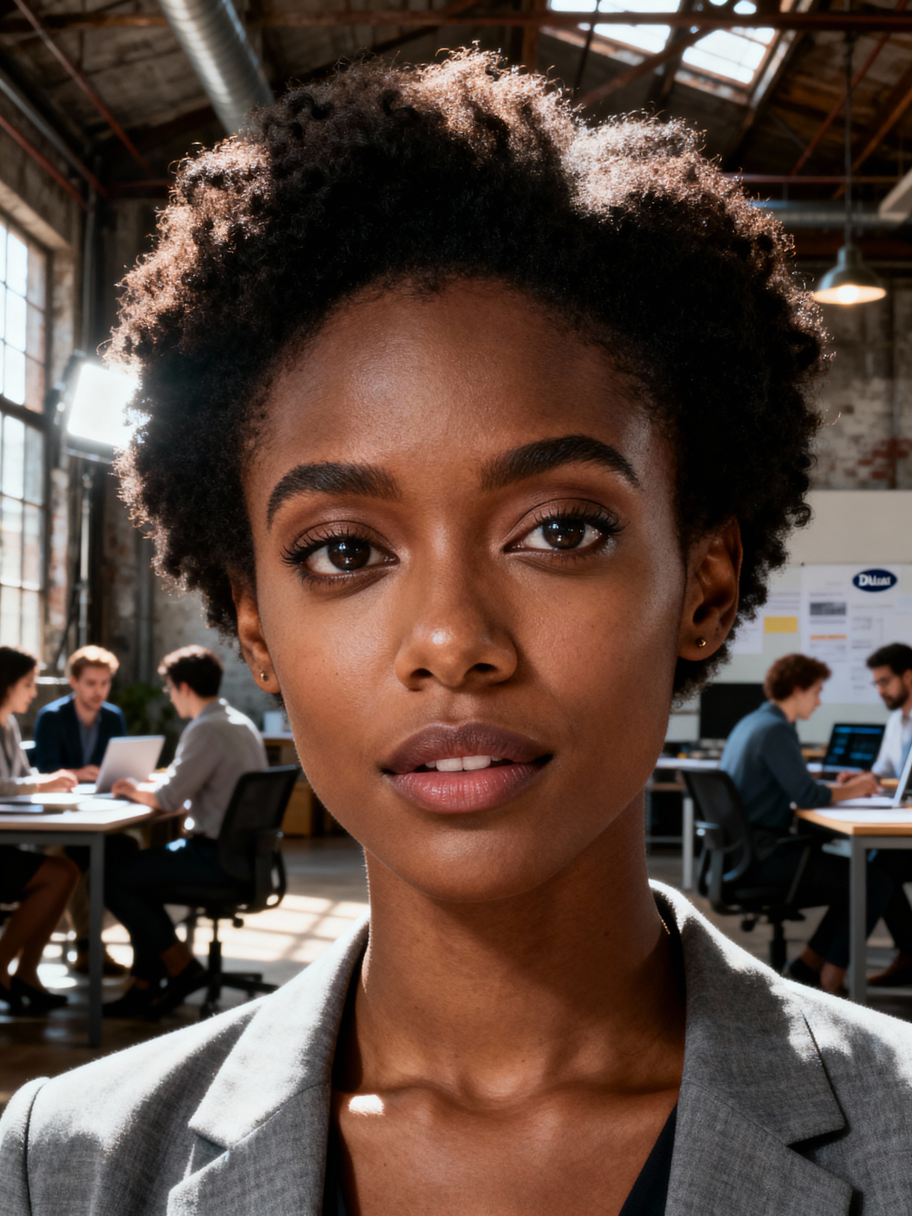 resilient model in comfortable yet polished professional attire industrial loft office, working with team members