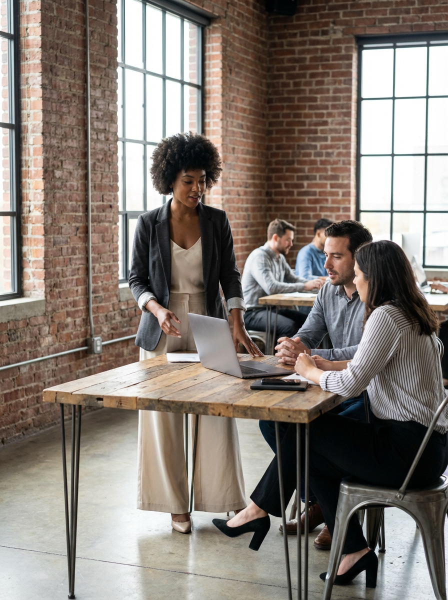 resilient model in comfortable yet polished professional attire industrial loft office, working with team members