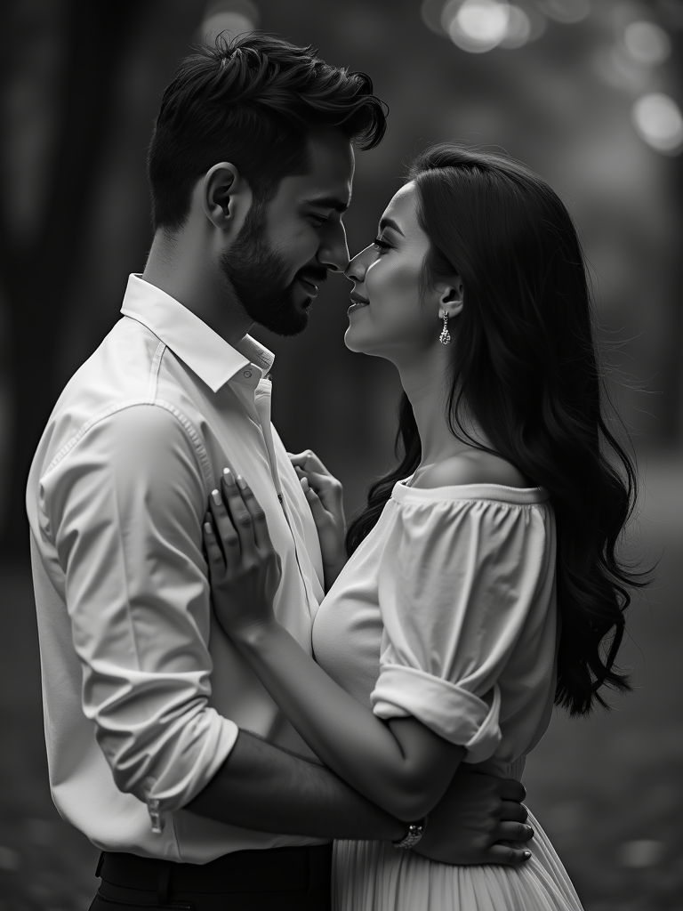 Romantic black and white engagement portrait. Wearing a formal dress shirt with rolled-up sleeves . Timeless and cinematic.