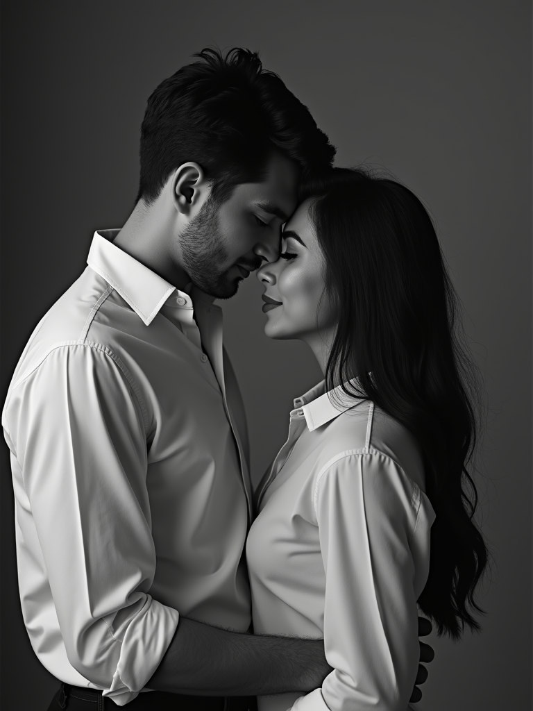 Romantic black and white engagement portrait. Wearing a formal dress shirt with rolled-up sleeves . Timeless and cinematic.