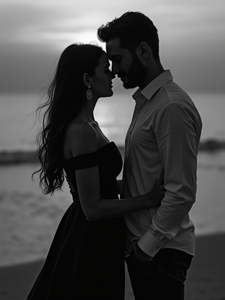 Romantic black and white engagement portrait. Wearing an elegant off-shoulder dress . Timeless and cinematic.
