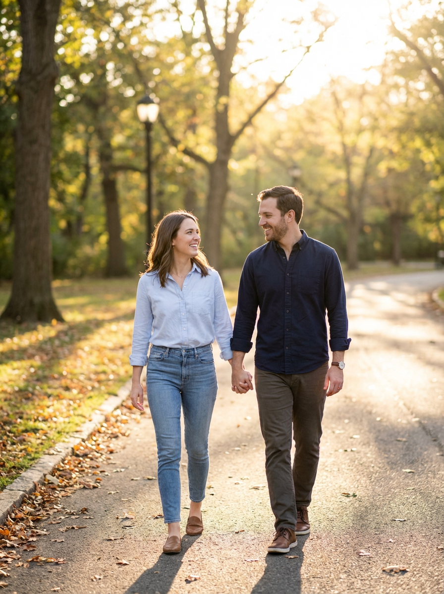 romantic photo of model with handsome boyfriend, couple holding hands walking through park at golden hour, casual date outfit, natural lighting, genuine smiles